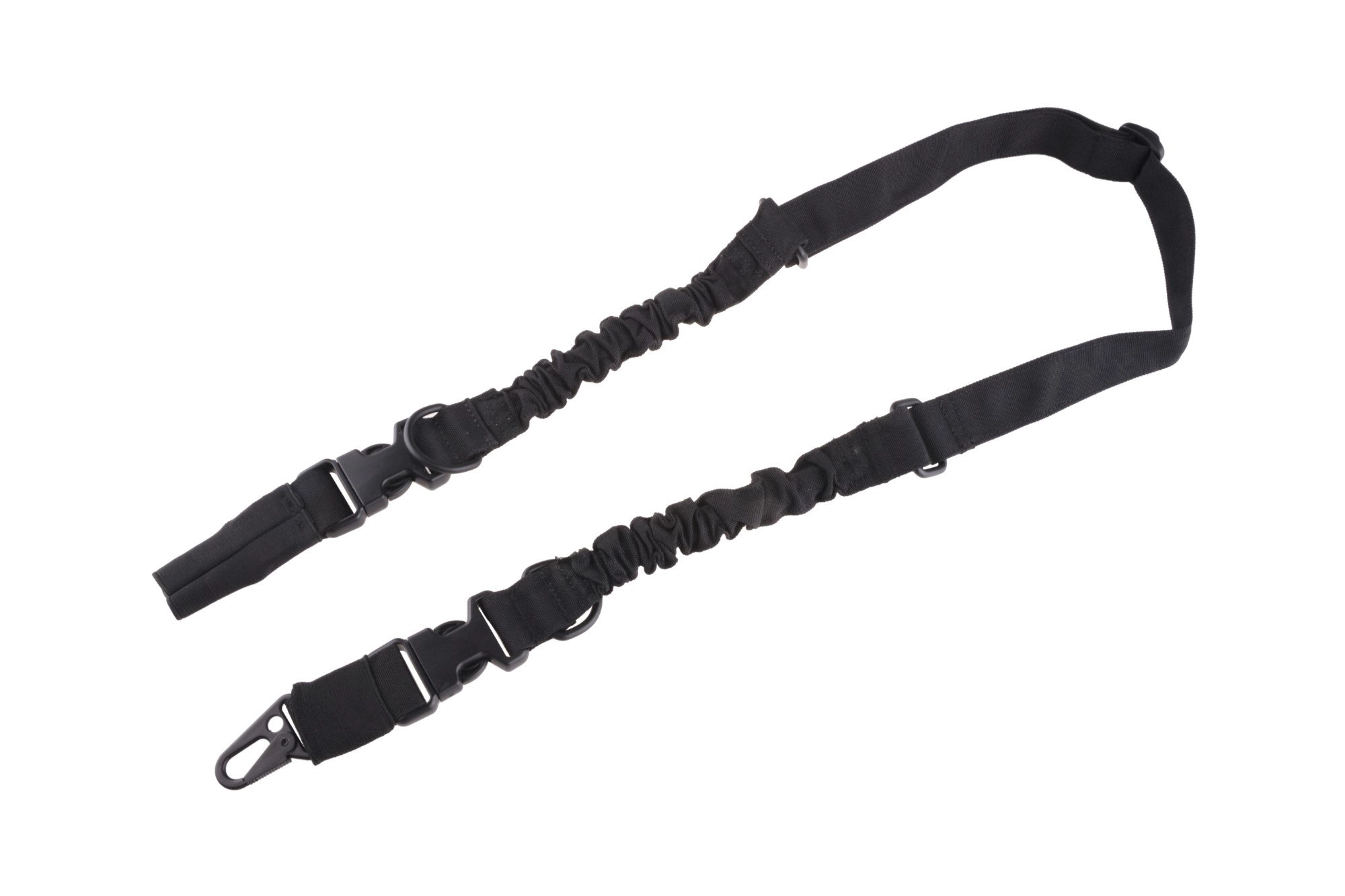 Dzięki klamrom zatrzaskowym mamy możliwość szybkiego wypięcia broni / całego zawieszenia. Na obu końcach pasa umieszczono metalowe D-ringi, do których możemy wpiąć jeden z karabinków mocujących i tym samym korzystać z zawieszenia w trybie 1-punktowym.