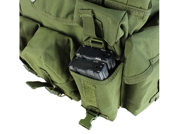 Holds up to six M16 mags Two large utility pouch One internal map pocket Padded shoulder straps with utility pouch Adjustable shoulder straps Adjustable quick release waist belt Imported