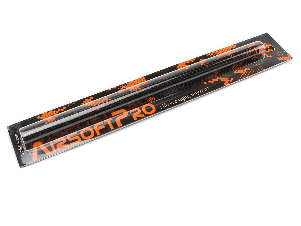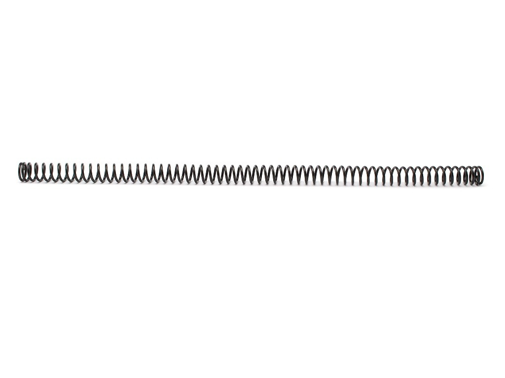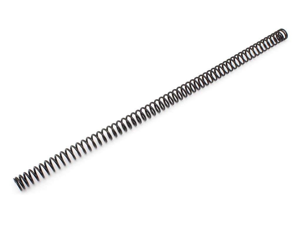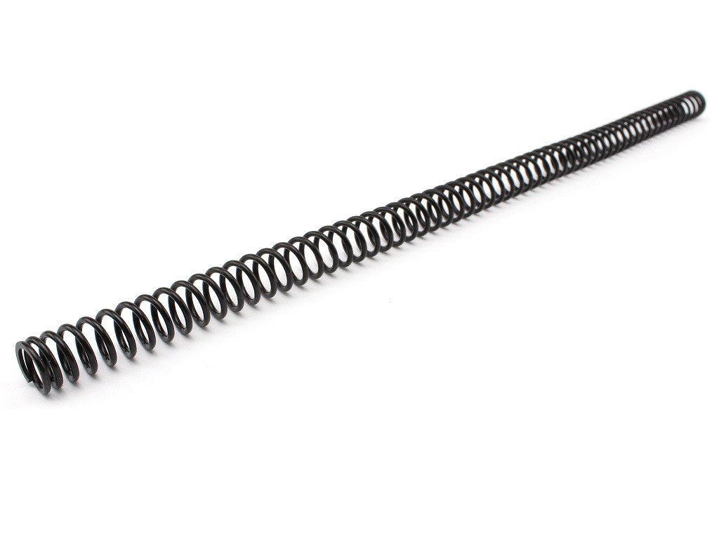 Spring for airsoft sniper rifles. It is made of spring steel with proper heat treatment and gives the final output of about 150 m/s (500 FPS). The spring has an inner diameter of about 7.5 mm and an outer diameter of 10.2 mm. The length is 251mm. It is therefore dimensionally suitable for most plastic basic piston