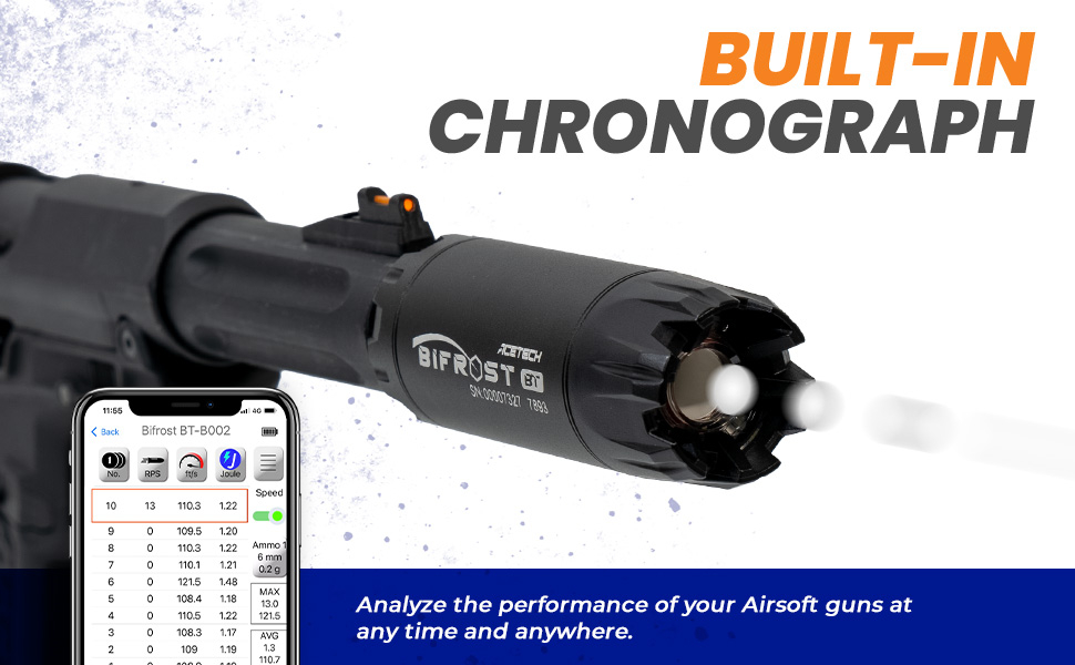 Chronograph:Built-in chrono measures muzzle velocity, ROF, and energy output with results displayed in the app.