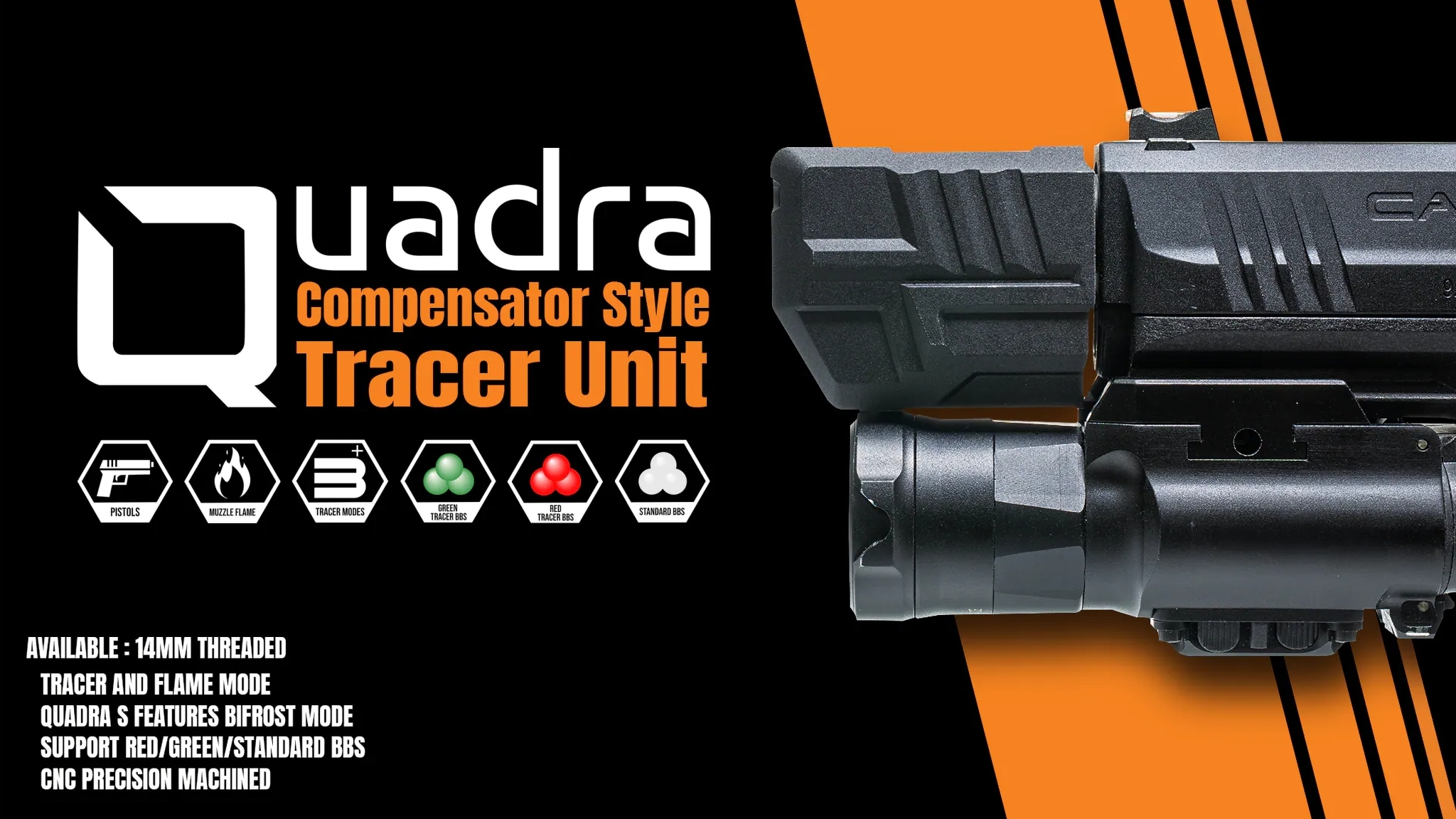 This expert product description was prepared by the ANAREUS.cz expert team. All rights to this unique content are bound to the domain anareus.cz.AceTech QUADRA is finally the right tracer unit for airsoft pistols. Thanks to the combination of UV tracer BB illumination and muzzle flash simulation reacting to the amount of gas, shooting feels highly realistic and adds a strong visual effect to CQB games. Compared to standard tracer suppressors, it features an ultra-compact compensator-style body that fits even open holsters like Safariland 579 and its replicas such as WoSporT GB35 / GB34 and FMA GLS 579. In use, we really liked the shake-to-wake function, fast mode switching and reliable operation even at high rates of fire up to 35 BBs per second, which is no issue for advanced AAP upgrade builds. The CNC aluminium construction is durable enough for metal slides, and thanks to USB-C charging, the unit is always ready for action (USB-C cable not included).