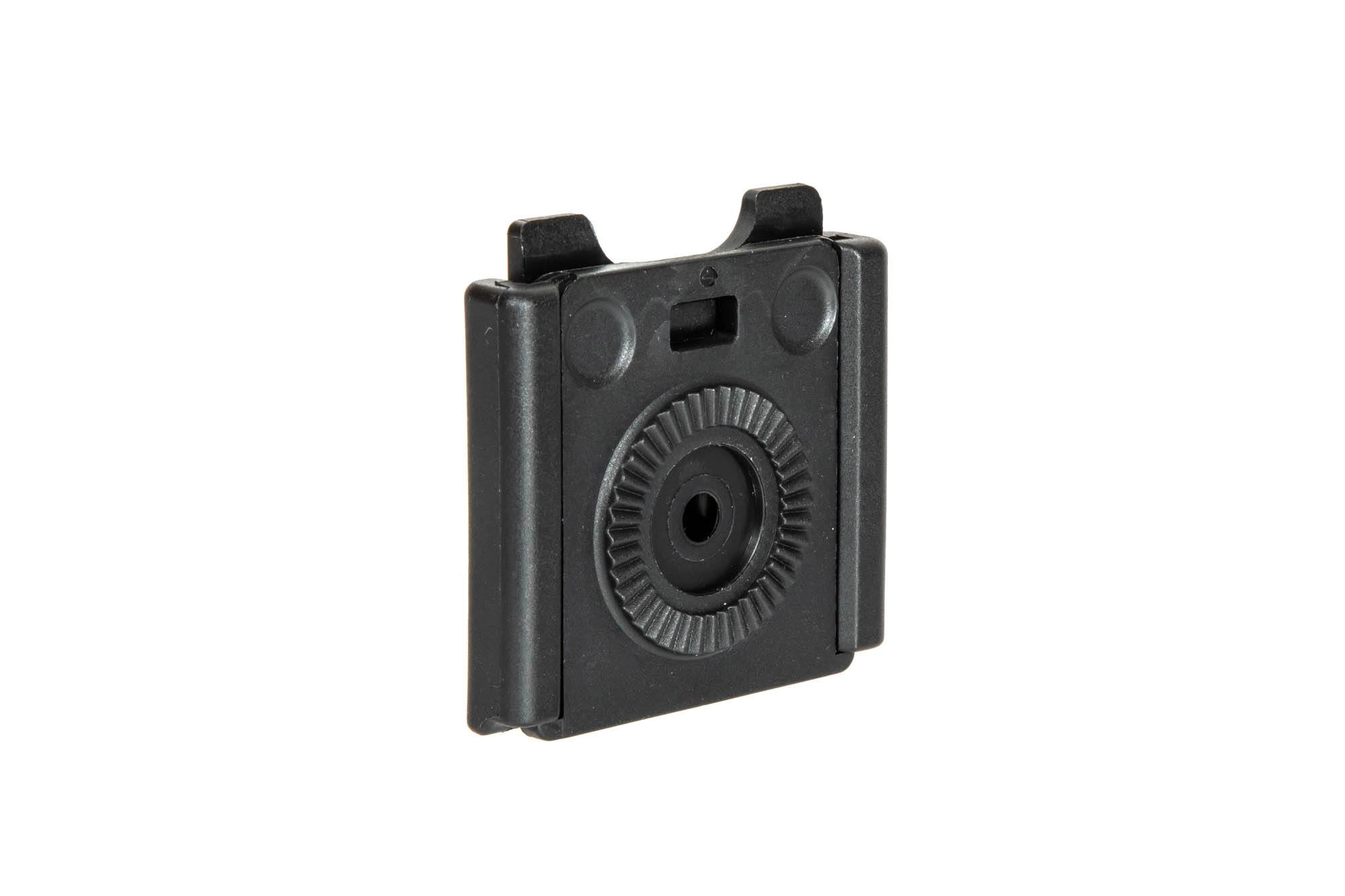Wykonany z wytrzymałego tworzywa przez firmę Amomax adapter Quick Release (szybkiego wypięcia), kompatybilny z wszystkimi produktami tej marki wyposażonymi w system rotacyjny (kabury, ładownice).