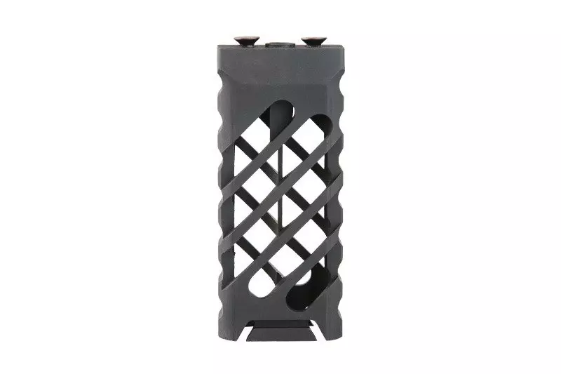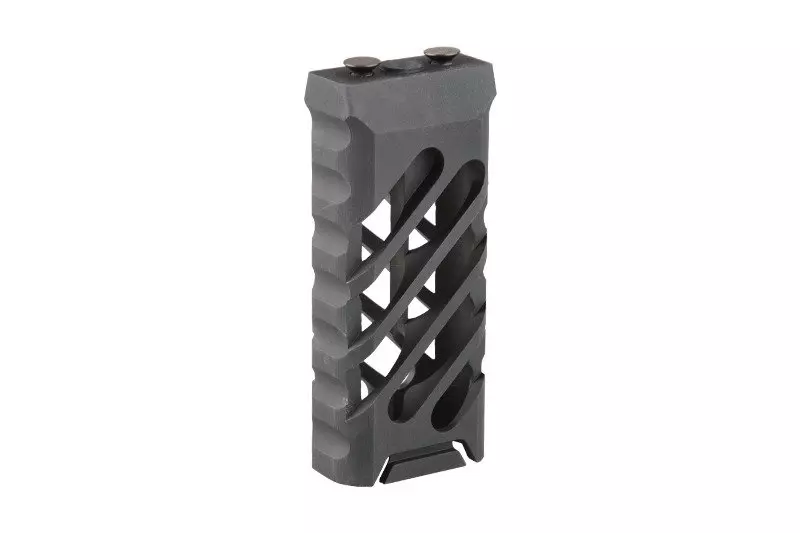 Wykonany z aluminium na maszynach CNC chwyt pionowy przeznaczony do montażu na szynach akcesoryjnych w standardzie Keymod. Chwyt ma strukturę szkieletową, zapewnia więc wysoką wytrzymałość (dzięki wykorzystanemu materiałowi), a jednocześnie niewielką wagę.