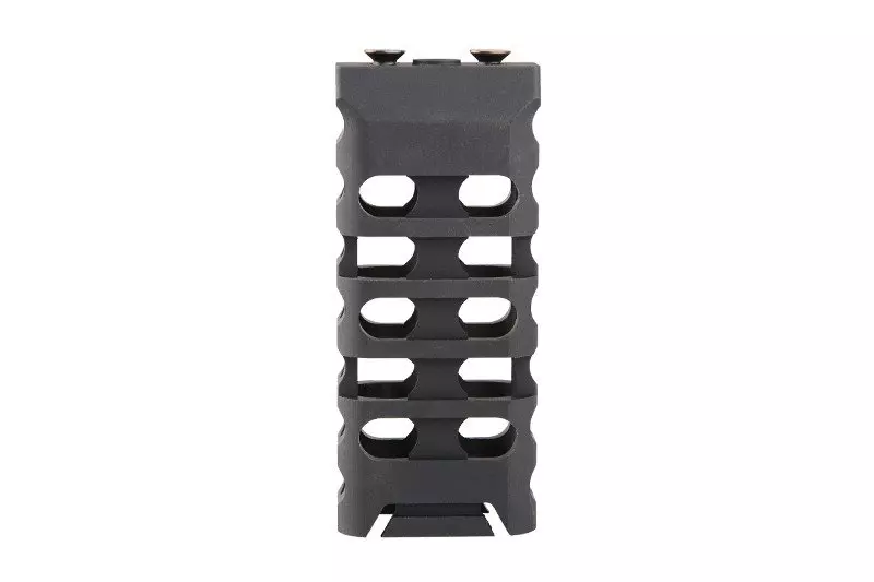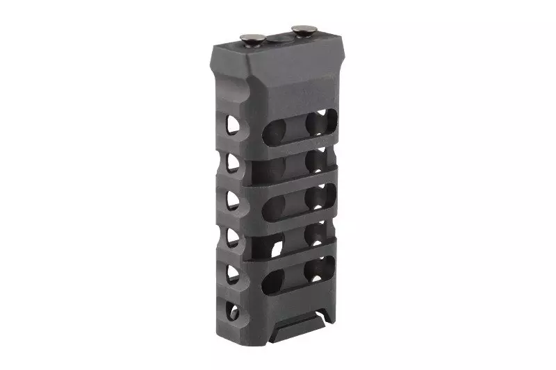 Wykonany z aluminium na maszynach CNC chwyt pionowy przeznaczony do montażu na szynach akcesoryjnych w standardzie Keymod. Chwyt ma strukturę szkieletową, zapewnia więc wysoką wytrzymałość (dzięki wykorzystanemu materiałowi), a jednocześnie niewielką wagę.