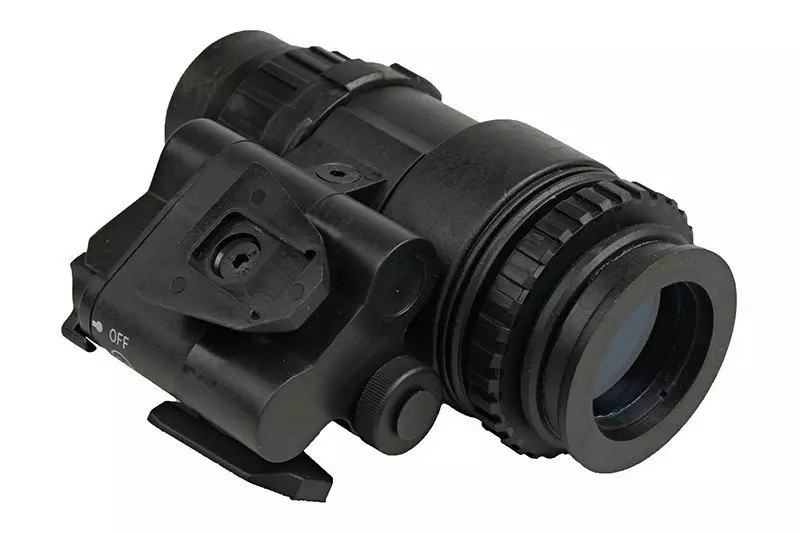 Replika monokularu noktowizyjnego AN/ PVS18. Została wykonana w skali 1:1 z wytrzymałego tworzywa sztucznego. Jest to atrapa, tzw. “wydmuszka”, więc nie jest funkcjonalna i nie posiada właściwości noktowizyjnych. Po zastosowaniu odpowiedniego montażu można ją zamocować na szynach montażowych replik różnego typu kasków/hełmów.