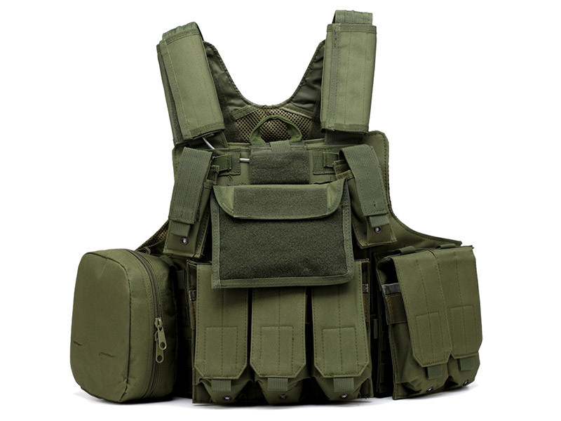 The vest includes admin pocket pouches on aid kit, 2pcs single pistol pouch, 1pc radio pouch, double pouch for M4/M16 magazines and triple pouch for M4/M16 magazines. The vest has MOLLE attachment.