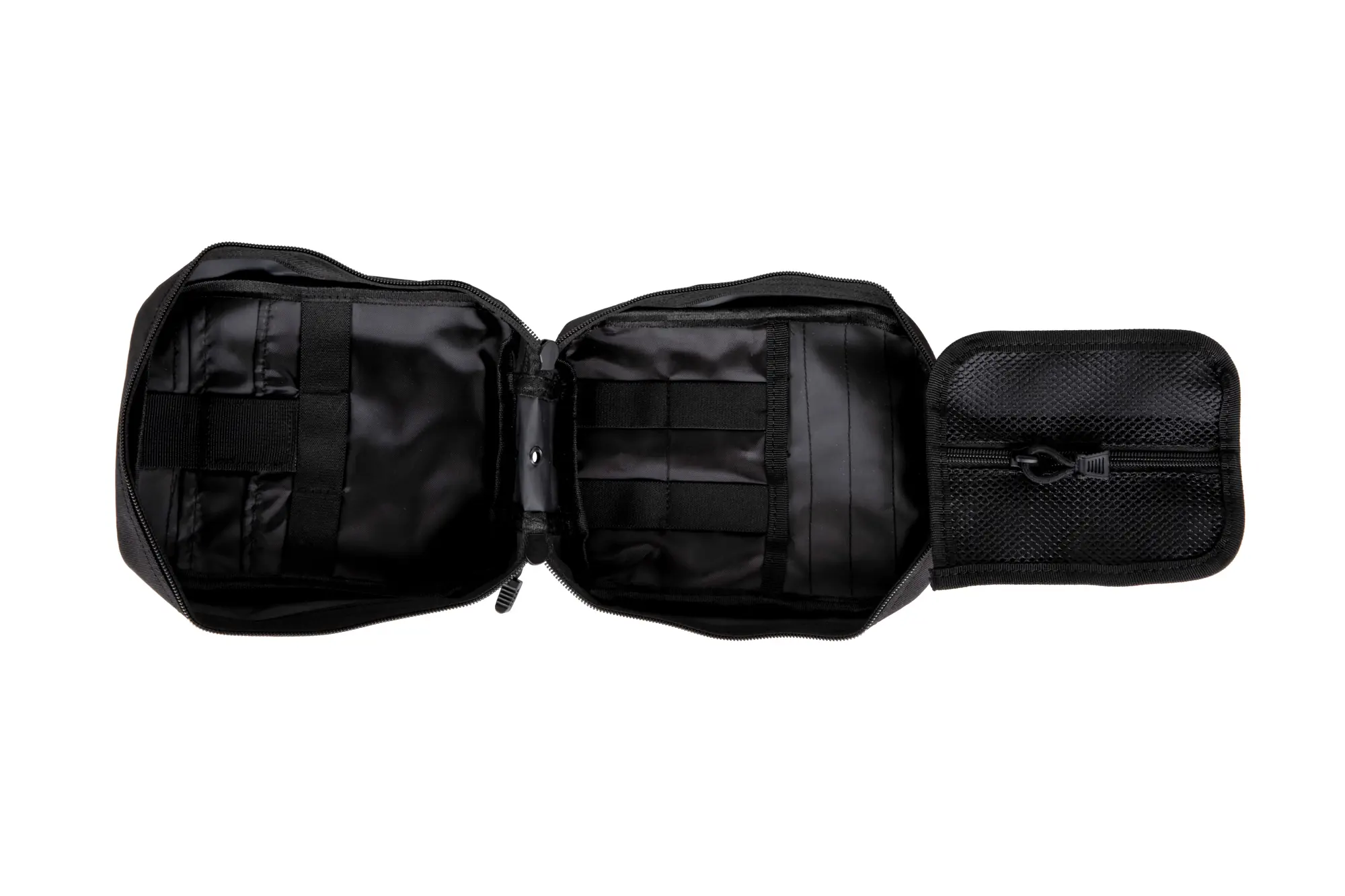 w dwie płaskie kieszenie w tym jedną zabezpieczoną taśmą z rzepem, na jedną z kieszeni naszyto palsy z elastycznego materiału – doskonale nadają się do przenoszenia bandaży czy długopisu. Na zewnętrznej ścianie znajduje się kolejna płaska kieszeń, dodatkowe palsy z elastycznego materiału oraz płaska, siatkowa kieszonka zapinana na zamek błyskawiczny,