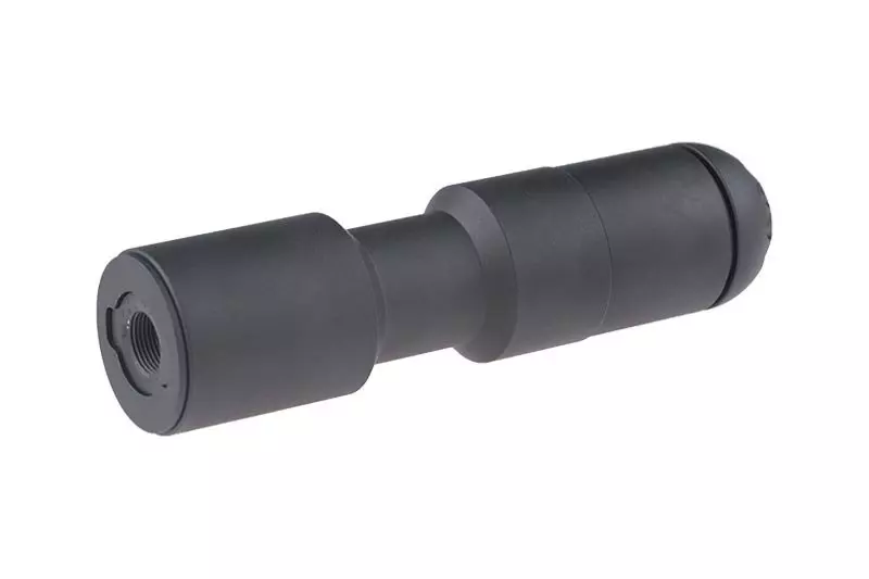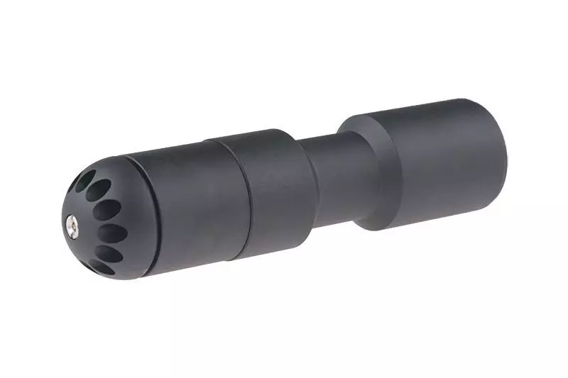 Wykonany w całości z metalu gazowy granat nasadkowy o pojemności 108 kulek. Granat ten jest świetną alternatywą dla graczy którzy nie chcą lub nie mogą zamontować na replice standardowego granatnika 40mm. W zestawie znajduje się przejściówka na gwint 14mm CCW na którą umieścić należy naładowany kulkami i gazem granat.