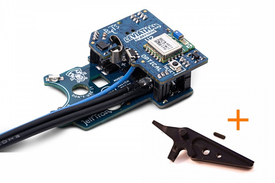 Leviathan V2 Optical is an electronic ETU unit with Bluetooth, designed to be installed in gearbox V2 and V2.5 based on the TM standard. Thanks to its optical sensors for shot detection and fire selector position, and an ultra-short switch (just 0.13 mm), it enables a precise hair trigger mode. The Real Feel Trigger System (RFTS) simulates realistic trigger resistance using a spring and provides trigger reset after each shot. You can configure firing modes, rate of fire, active braking, pre-cocking, virtual magazine, and more in real time using the JeffTron app. The input and output ports allow connection of accessories such as flashlights, electric magazines, or an empty magazine sensor. The unit is coated with conformal lacquer. It supports high-RoF setups including DSG gearsets and is ready for Brushless motors like Warhead. All changes made in the app are saved instantly to the unit’s memory. Additionally, the unit comes with a CNC aluminum trigger from Retro Arms featuring an adjustable screw for pre-travel and stylish design.