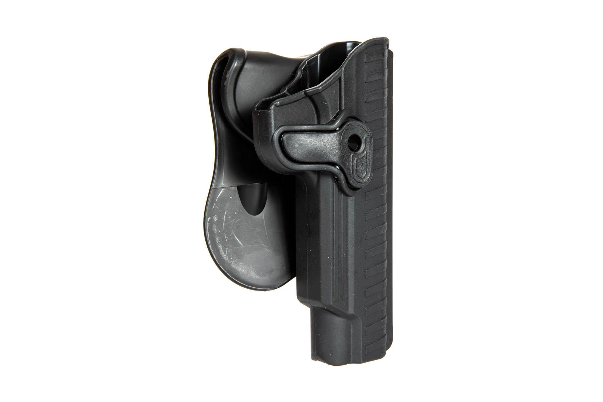 Lekka i wytrzymała polimerowa kabura dedykowana do replik pistoletów typu 1911. Kabura została wyposażona w regulowaną płetwę do mocowania na pasie o szerokości max 60mm. Prosta i skuteczna blokada zwalniana jest palcem wskazującym – doskonale chroni pistolet przed wypadnięciem, a dobywanie i chowanie pistoletu jest dzięki niej szybkie i intuicyjne.