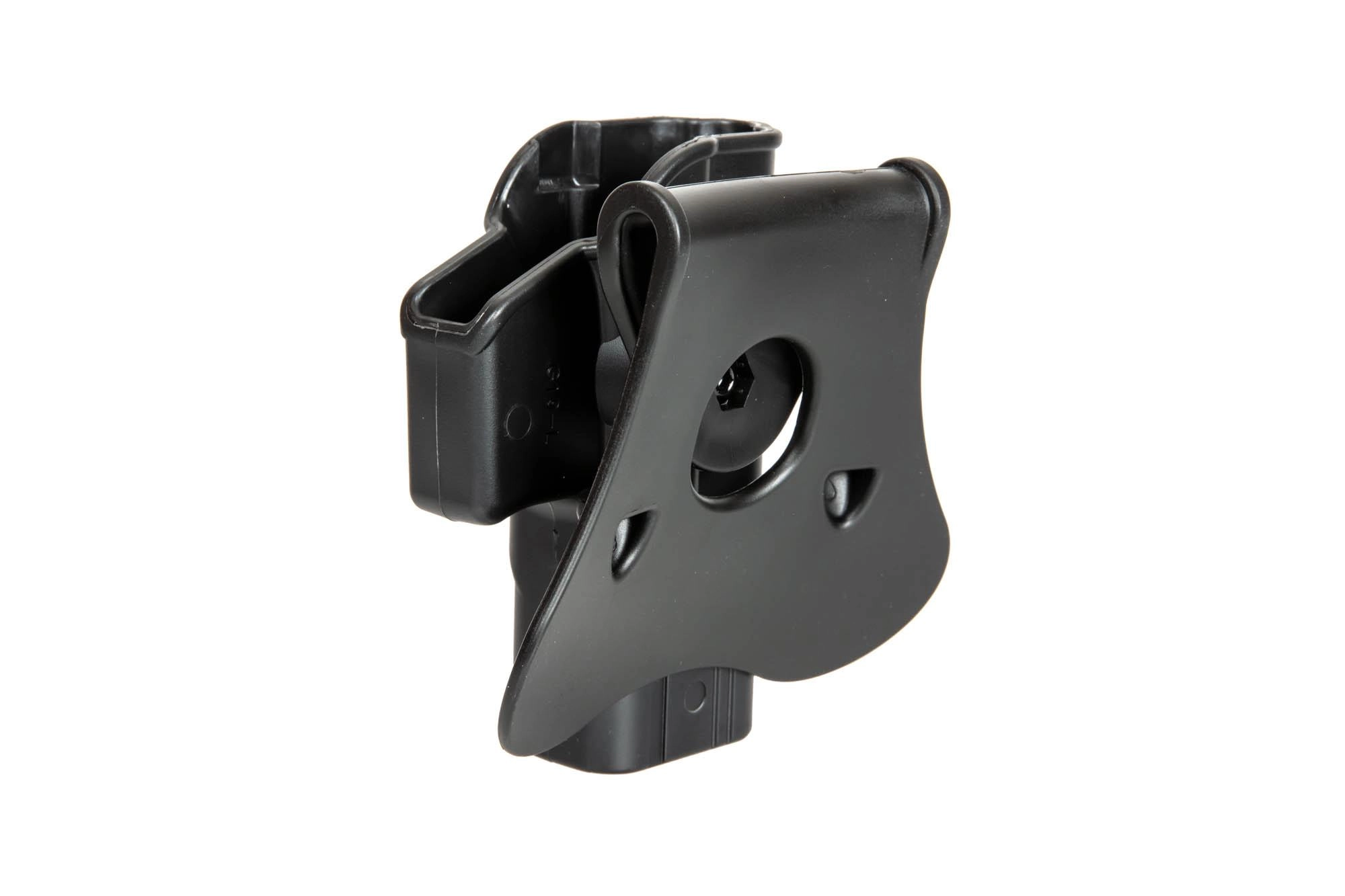 Wyprodukowana z wytrzymałego polimeru przez firmę Amomax kabura pistoletowa. Posiada intuicyjną blokadę zwalnianą palcem wskazującym podczas dobycia broni.