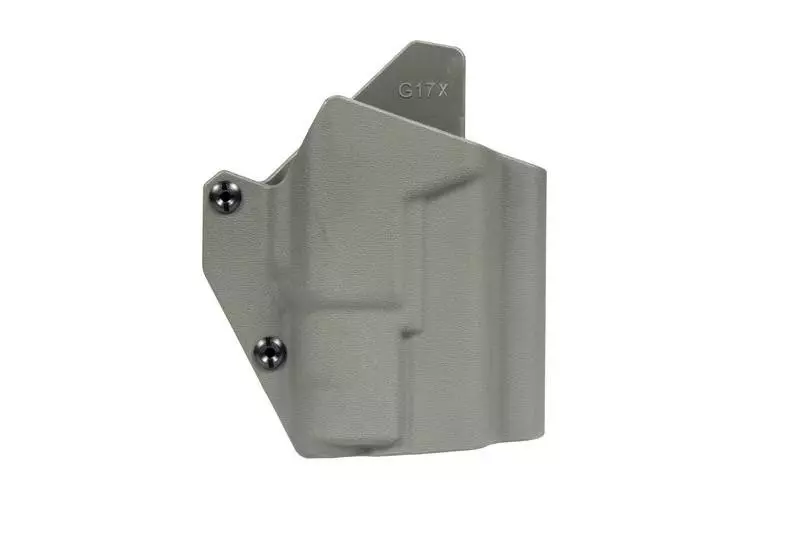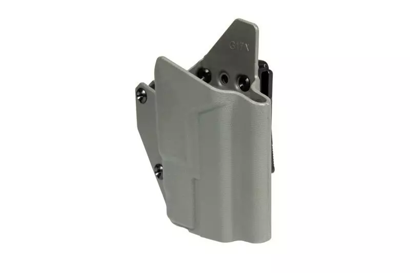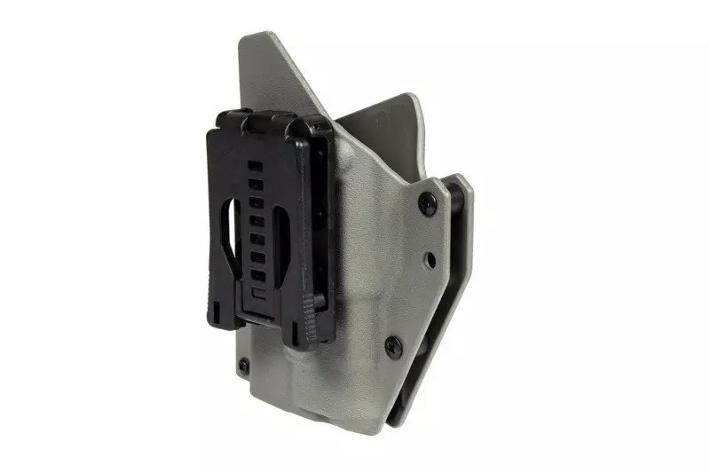 Wykonana z wytrzymałego tworzywa sztucznego przez firmę FMA kabura taktyczna przeznaczona do montażu na pasach taktycznych o maksymalnej szerokości 50mm. Do kabury pasują repliki pistoletów Glock 17, także te wyposażone w oświetlenie taktyczne.