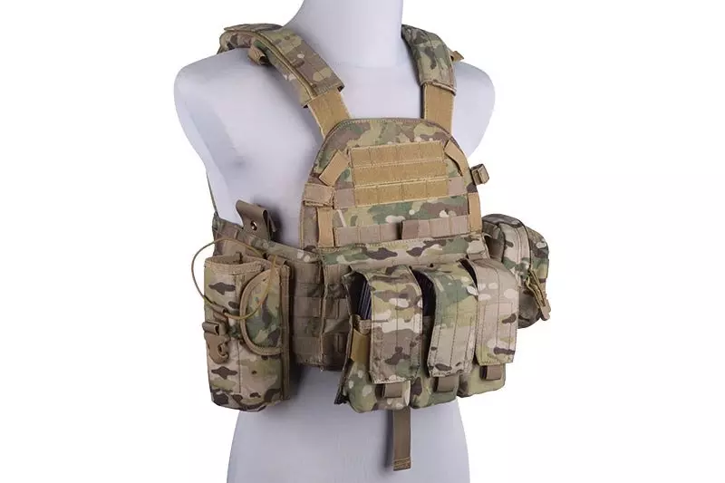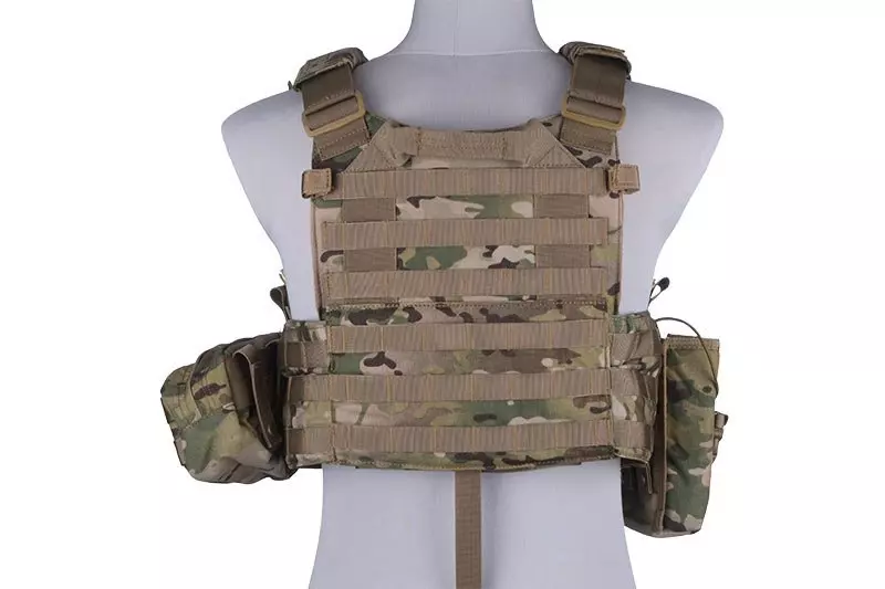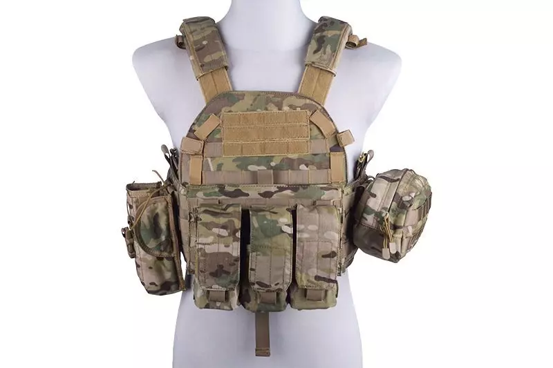 Wykonana z wytrzymałej Cordury 500D kamizelka taktyczna plate carrier typu 6094. Zbudowana jest z dwóch paneli połączonych szerokim cummerbundem oraz wygodnymi padami na ramionach. Na całej powierzchni kamizelki umieszczono palsy systemu MOLLE, palsy umieszczone w górnej części kamizelki obszyte są rzepem co pozwala umieścić np. morale patch’e. Po bokach umieszczono dodatkowe rzepy do zapięcia np. rurki systemu hydracyjnego. W cummerbundzie kamizelki, po obu stronach umieszczono dwie płaskie siatkowe kieszonki, umożliwiają przenoszenie dodatkowych akcesoriów czy magazynków. W zestawie, wraz z kamizelką znajduje się dodatkowo: