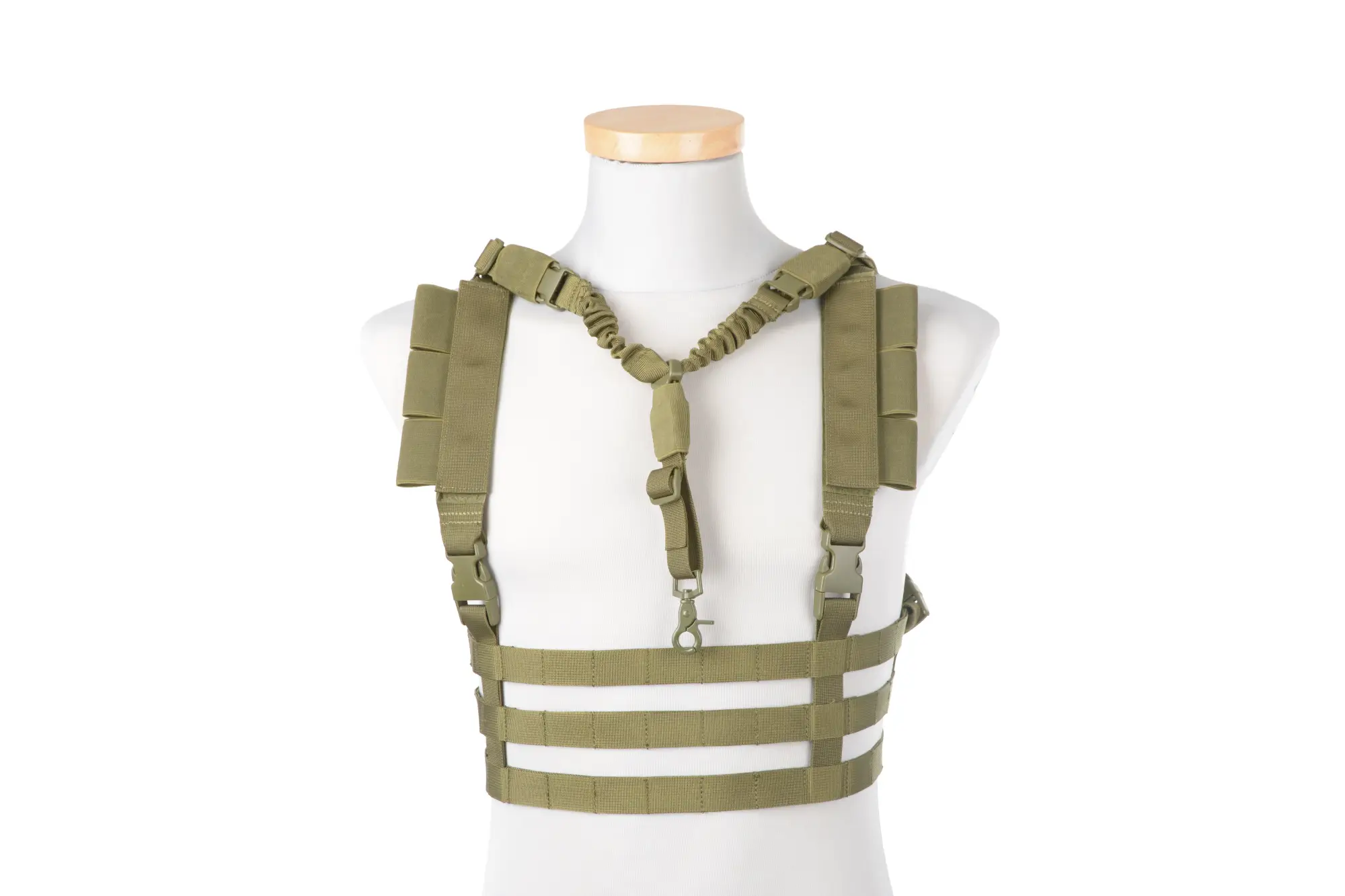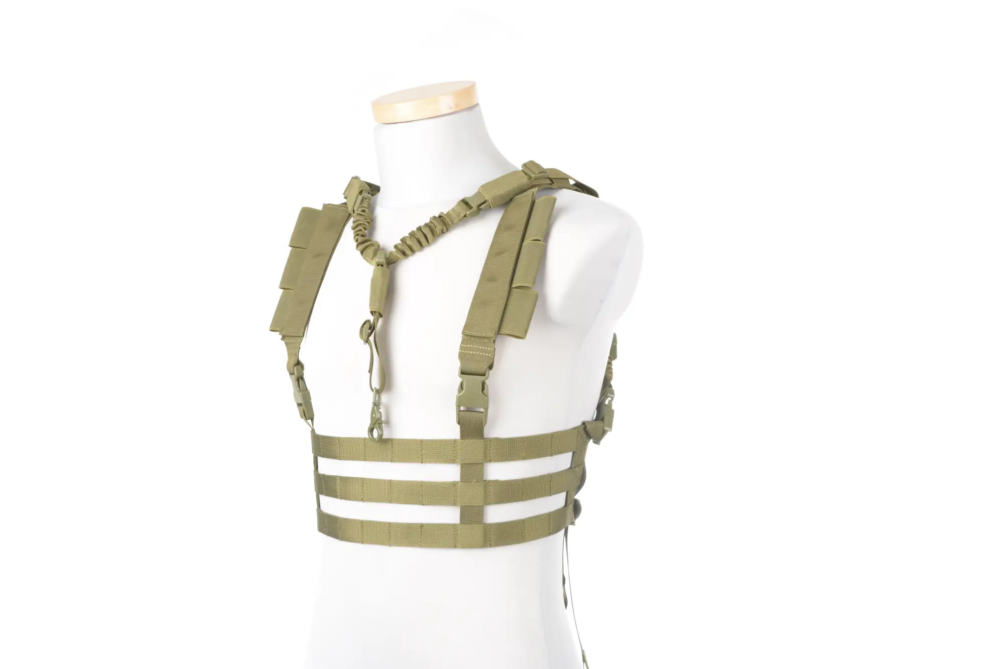 Niskoprofilowa kamizelka taktyczna typu Chest Rig. To bardzo lekka kamizelka, wykonana z odpornego na warunki atmosferyczne nylonu o splocie 1000D. Dzięki swojej wyjątkowo prostej lecz funkcjonalnej konstrukcji praktycznie nie wpływa na ograniczenie swobody ruchu. Dodatkowo pozostawia pełną swobodę costomizacji użytkownikowi. Palsy zgodne ze standardem Molle pozwalają na montaż akcesoriów szerokiej gamy wyposażenia taktycznego, jak np. kieszenie i ładownice. Kamizelka posiada oprócz tego w zestawie elastyczny, jednopunktowy, regulowany pas z karabińczykiem, na którym możemy zawiesić replikę. Dla uzyskania jak największej wygody główne pasy nośne są wzbogacone o rozciągliwe bungee cordy gwarantujące doskonałe ułożenie kamizelki na torsie nie powodując jednocześnie ucisku.