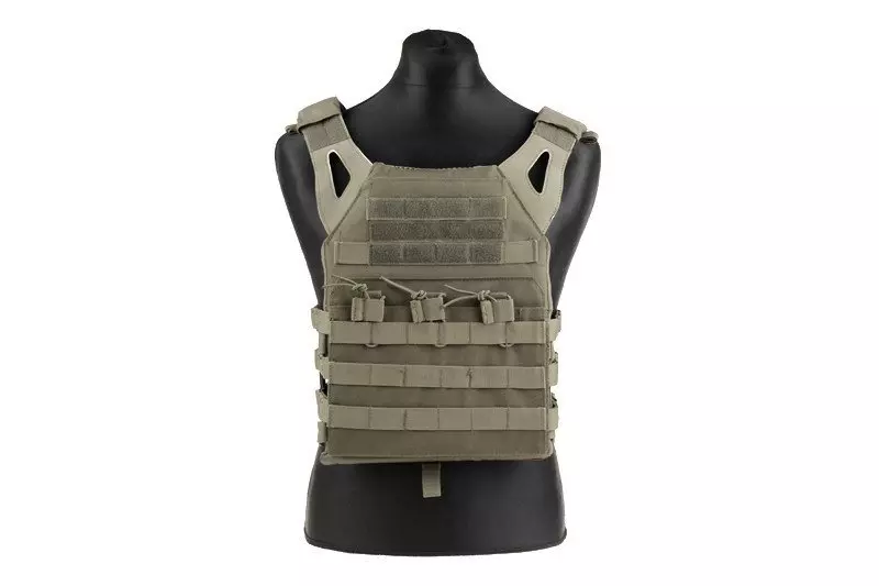 Bardzo lekka i funkcjonalna kamizelka typu plate carrier, uszyta z wytrzymałego nylonu. Zbudowana z dwóch paneli – przedniego oraz tylnego, połączonych lekkim, szkieletowym cummerbundem, który składa się jedynie z usztywnionych taśm. Nie ma problemu aby na tych taśmach zamocować dodatkowe kieszenie modułowe.