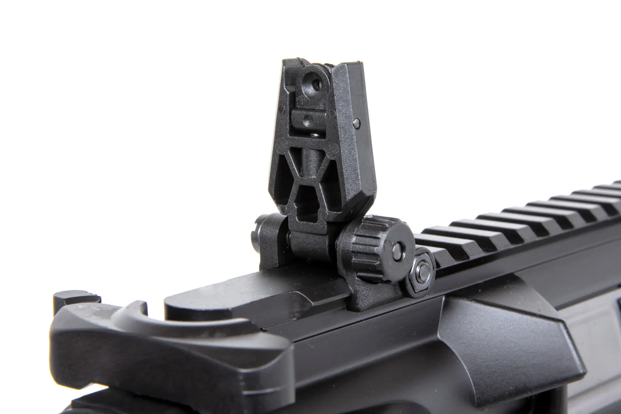 Lufa zakończona jest standardowym urządzeniem wylotowym osadzonym na gwincie 14mm CCW. Na grzbiecie repliki umieszczono składane przyrządy celownicze.