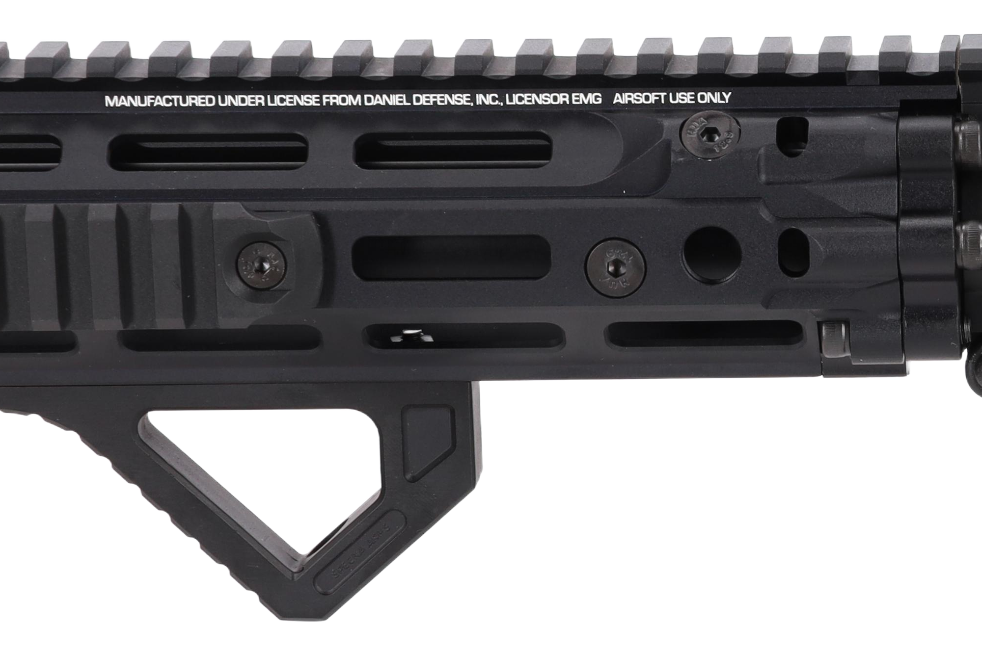 Na korpusie umieszczono indywidualny numer seryjny oraz grawer marki Daniel Defense®. Wartymi uwagi elementami w replice są: