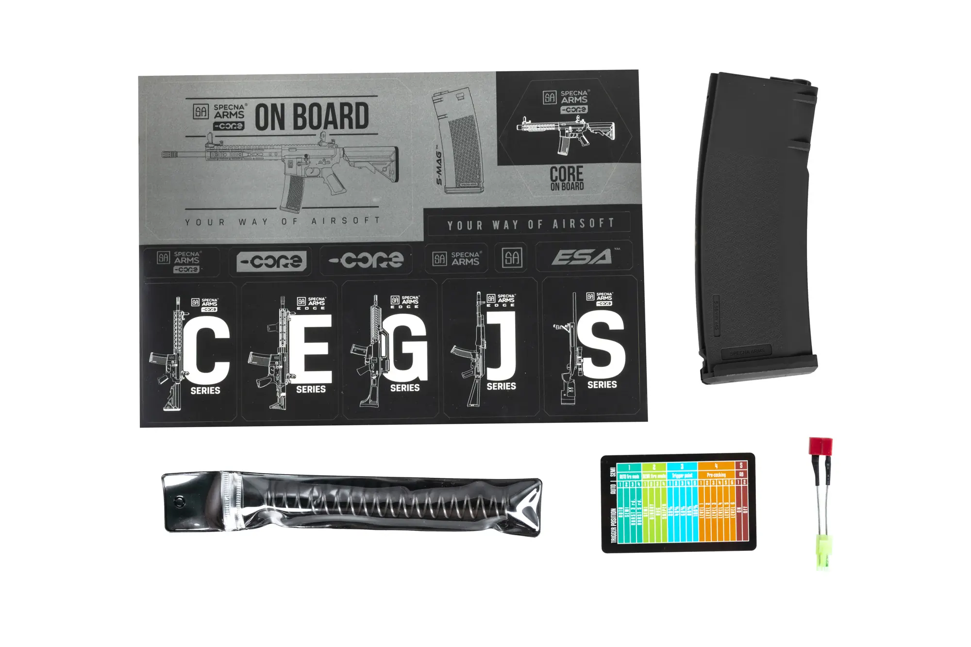 Specna Arms wychodząc naprzeciw oczekiwaniom klientów prezentuje linię CORE™ – wyjątkową serię replik, która wprowadza nową jakość na rynku. Atrakcyjna cena w połączeniu z wysokiej jakości materiałami sprawia, że jest to seria zarówno dla początkujących jak i wytrawnych airsoftowych graczy. W zestawie dołączono wbudowany układ HAL™. Układ kontroli spustu wspomaga działanie repliki oraz umożliwia programowanie funkcji w łatwy sposób przy użyciu spustu oraz selektora.