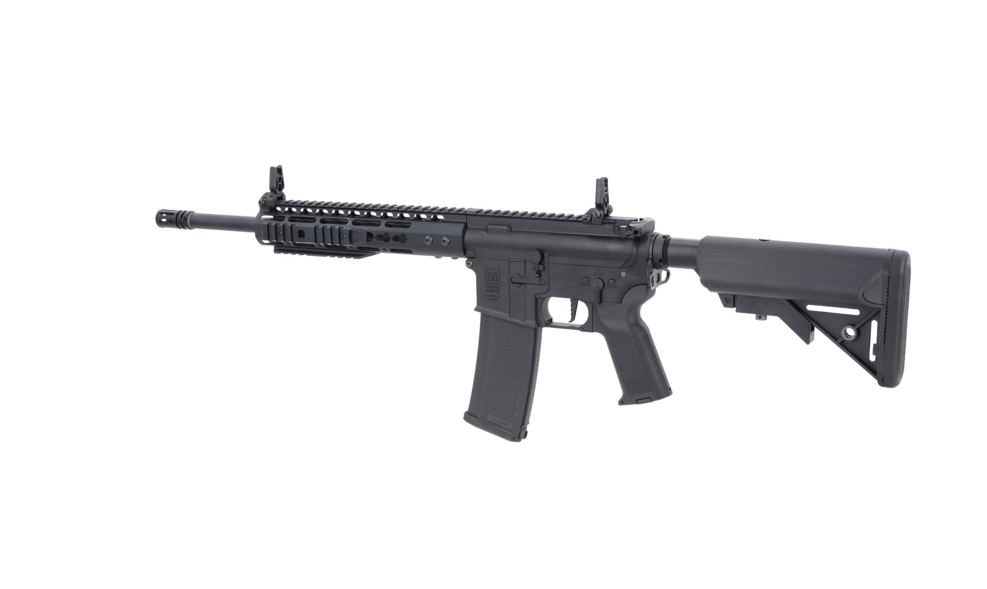Na korpusie umieszczono oznaczenia Specna Arms oraz indywidualny numer seryjny. Warte uwagi detale to chwyt pistoletowy QD, zapewniający łatwy i szybki dostęp do silnika bez konieczności użycia narzędzi oraz obustronne ucho do montażu zawieszenia taktycznego.