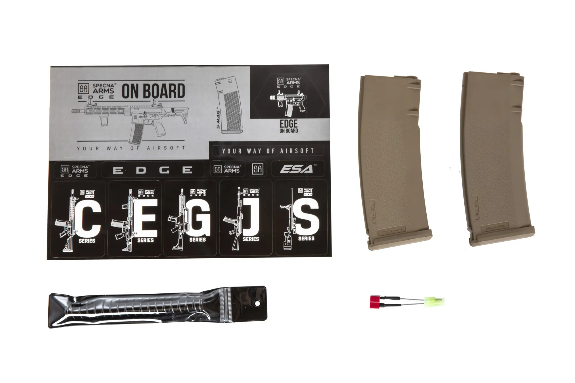 W pudełku z repliką znajdują się dwa magazynki mid-cap S-MAG o pojemności 125 kulek każdy. S-MAG to ekskluzywny magazynek polimerowy zaprojektowany przez Specna Arms. Na uwagę zwraca charakterystyczna faktura złożona z logotypów Specna Arms. S-mag zapewnia bezproblemowe podawanie kulek, nawet przy wysokim ROF.