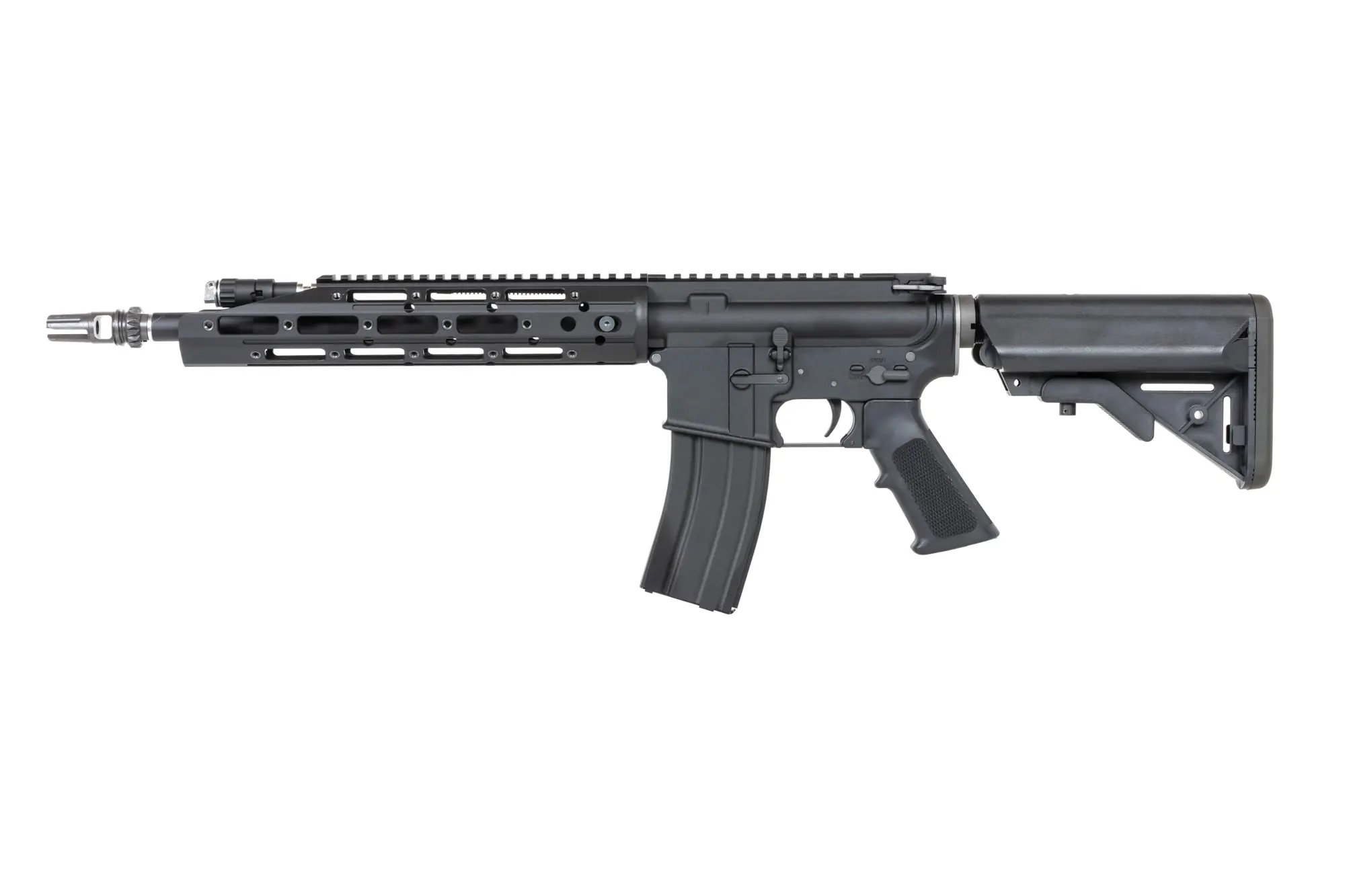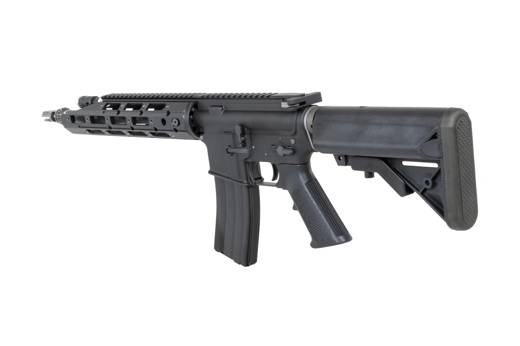 Ze stali wykonano: tłumik płomienia, zatrzask rączki przeładowania, pierścień mocowania prowadnicy, wszystkie piny oraz śruby. Wewnątrz repliki ze stali wykonano dodatkowo: niektóre elementy układu spustowego oraz suwadła, sprężynę buffera, pin sprężyny buffera. Z aluminium wykonano łoże M-LOK o długości 11.5 cala, atrapę bloku gazowego, lufę zewnętrzną, korpus, grzbietową szynę RIS, manipulatory oraz prowadnicę kolby. Z tworzywa zaś wykonano chwyt pistoletowy oraz regulowaną kolbę.