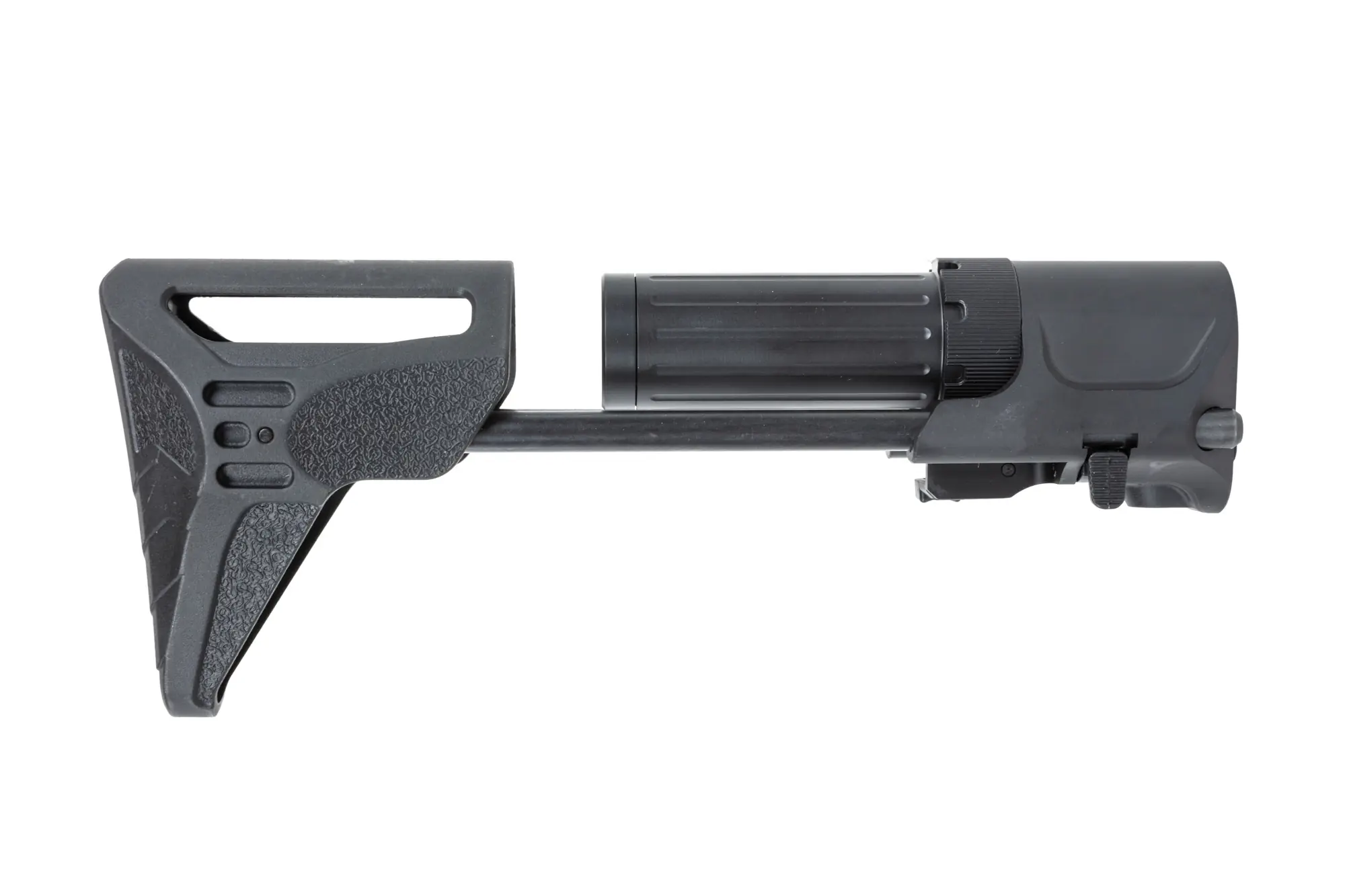 Kolba posiada podwójną blokadę, która uniemożliwia przypadkowe wysunięcie kolby z korpusu. Do odkręcanej atrapy buffer tube można zmieścić akumulator LiPo o wymiarach maksymalnych 15x11x115mm. Przykładowy akumulator: https://gunfire.com/pl/products/akumulator-lipo-7-4v-1200mah-25-50c-t-connect-deans-1152214387.html