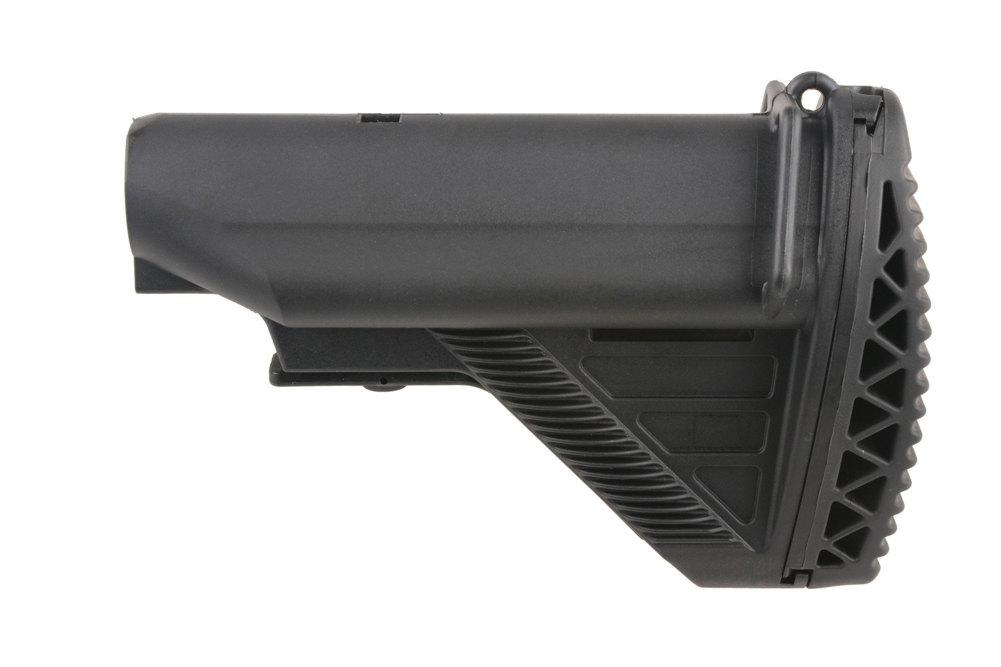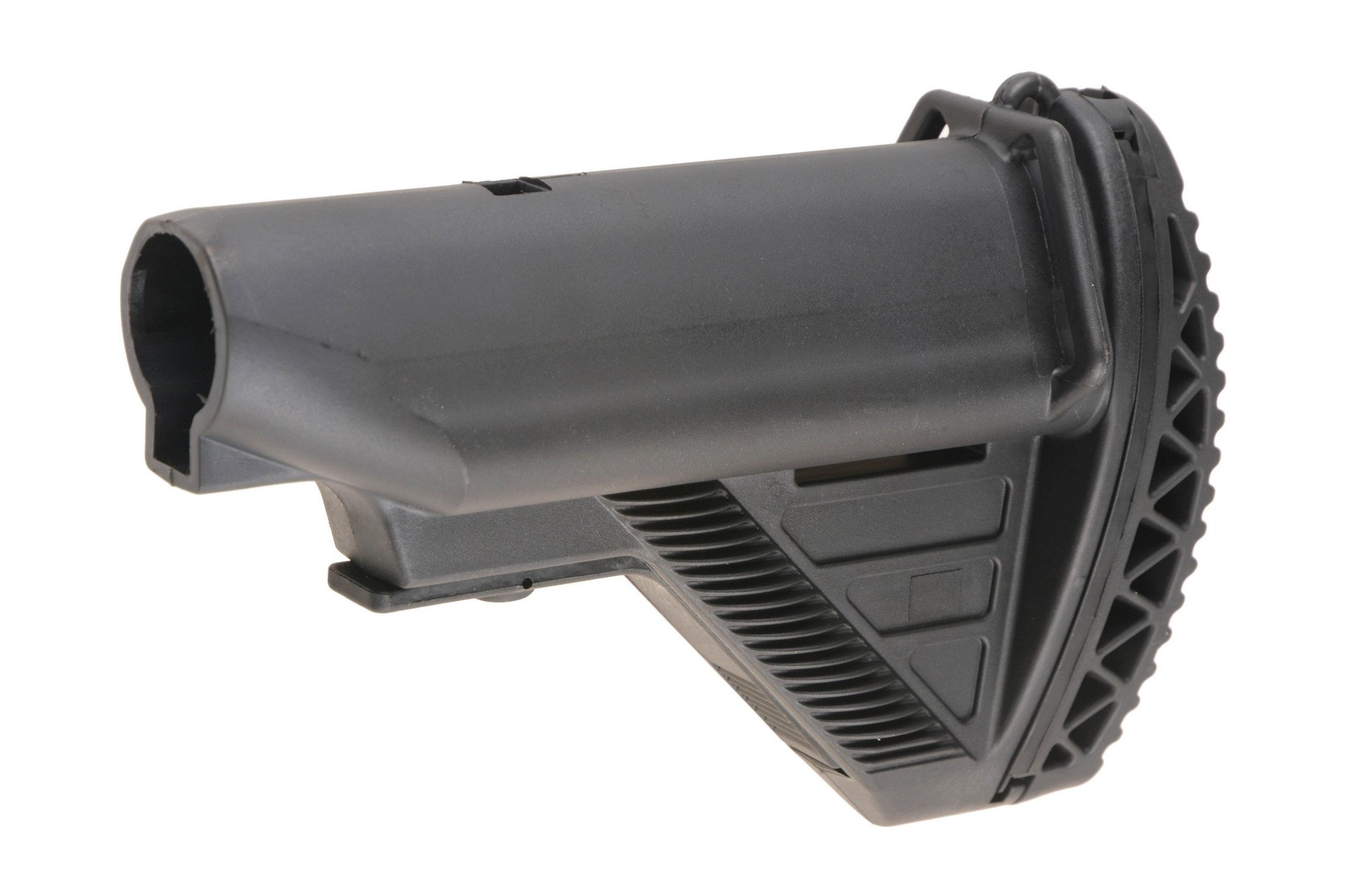 Wykonana z mocnego tworzywa polimerowego kolba teleskopowa o regulowanej długości, przeznaczona do montażu w karabinkach z prowadnicami typu M4. Kolba posiada wygodną stopkę z twardej gumy, która stanowi jednocześnie osłonę wnętrza kolby zawierającego 2 podłużne sloty na 4 baterie.