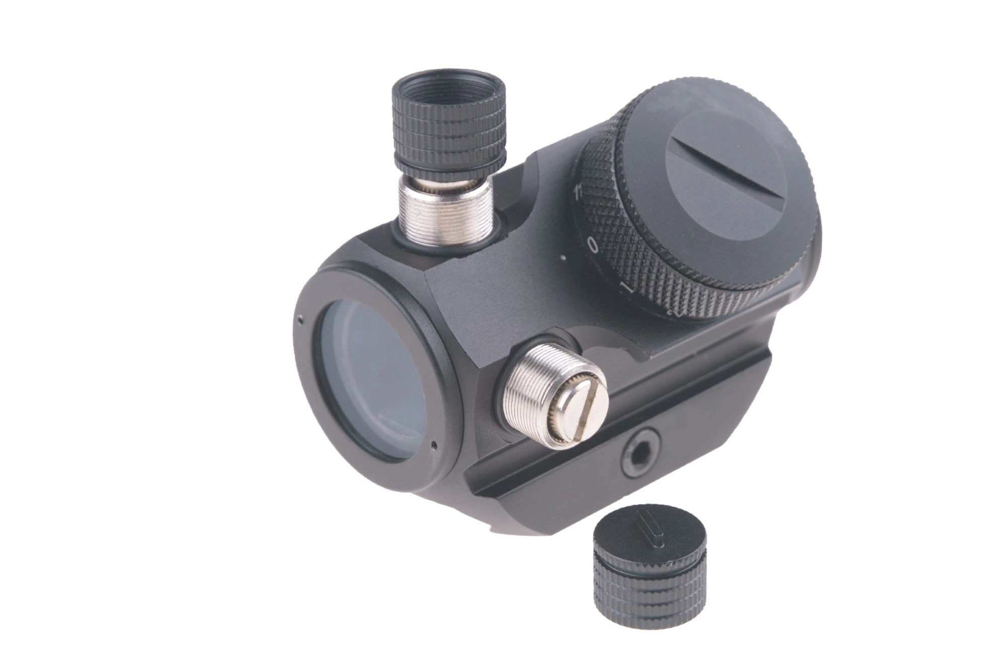 Średnica soczewki wynosząca 20mm stanowi idealny kompromis pomiędzy wielkością, wytrzymałością, polem widzenia, a ryzykiem odbicia światła w soczewce. Wyrazista faktura nakrętek osłaniających wieżyczki regulacji, ułatwia ich zakręcanie lub odkręcanie. Dodatkowo, nakrętki pełnią rolę kluczy regulujących, dzięki czemu strzelec może szybko i beznarzędziowo skorygować ustawienia punktu celowniczego. Pojedyncze “kliknięcie” wieżyczki odpowiada przesunięciu punktu celowniczego o 1MOA. Znajdująca się w zestawie gumowa osłona pozwala na zabezpieczenie soczewki podczas transportu.