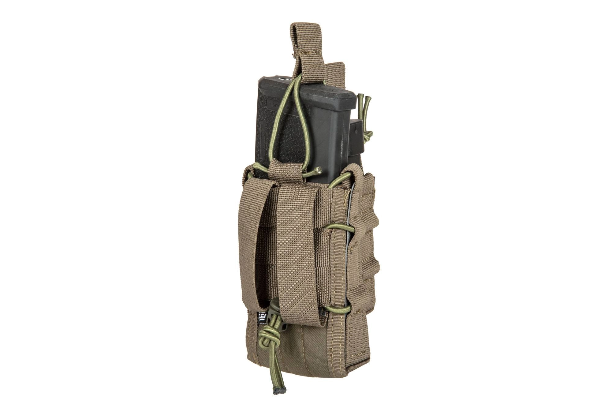 Ładownica uniwersalna typu shingle na 2 magazynki – karabinowy i pistoletowy została wykonana z lekkiej i trwałej Cordury 500D. Zastosowanie wytrzymałych szwów oraz wysokiej jakości taśm dodatkowo zwiększają odporność i trwałość. Dzięki możliwości regulowania objętości pomieści magazynki typu AK / M4 / G36 / M14 / SR25 oraz wiele innych. Magazynek jest od góry zabezpieczony przed wypadnięciem elastyczną linką typu shock-cord.