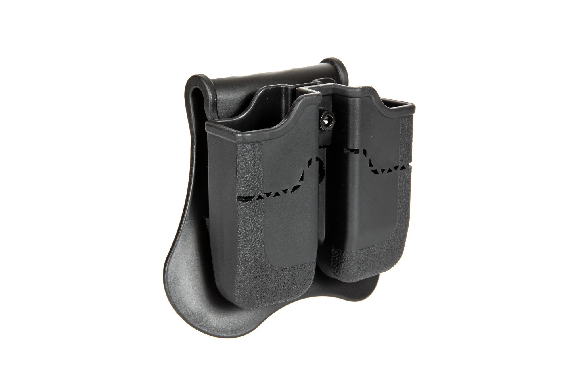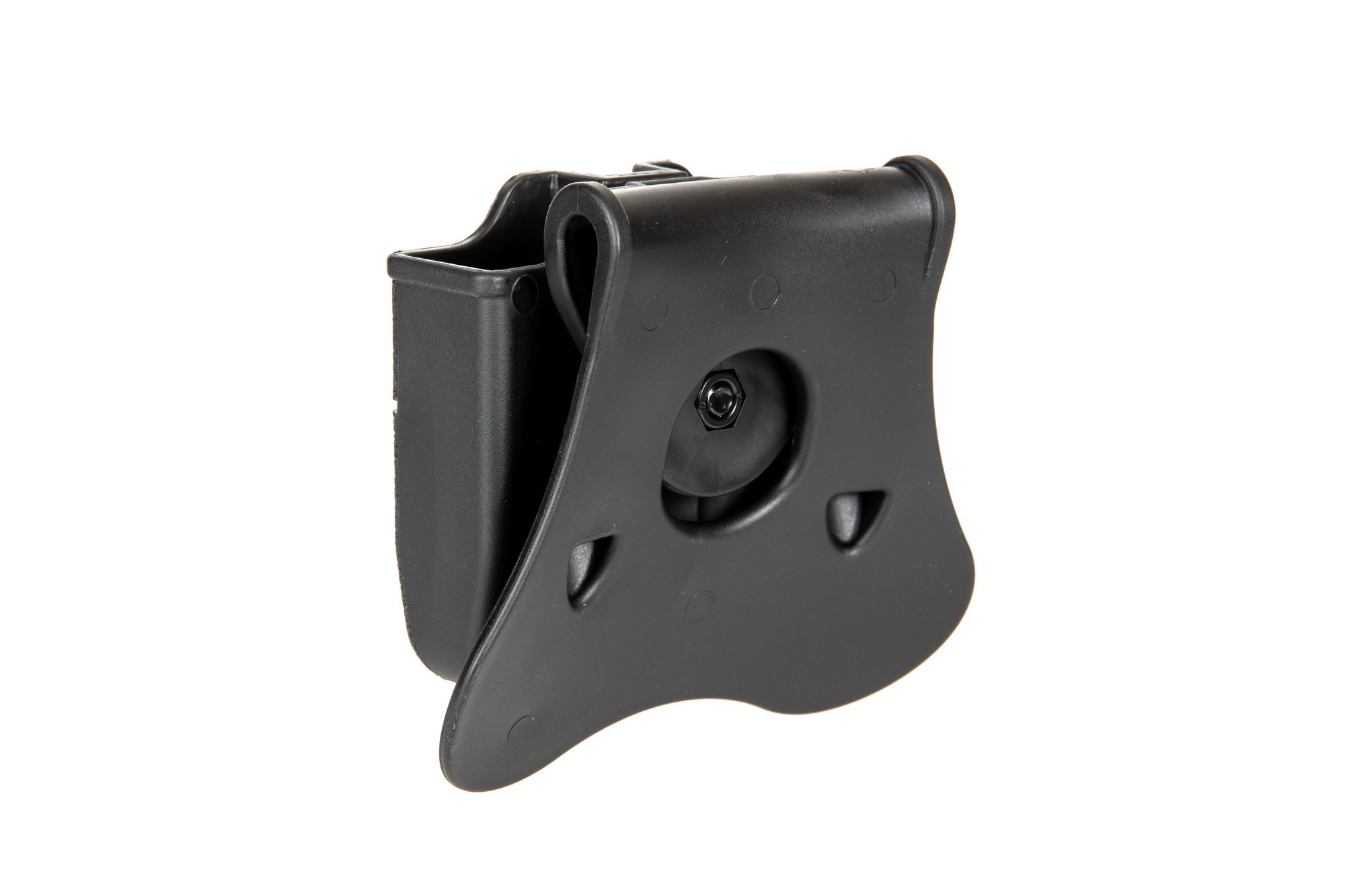 Montaż na pas posiada szeroką płetwę zapewniającą dobrą stabilność. Ponadto ładownica posiada system rotacji, dzięki któremu istnieje możliwość zmiany kąta położenia pistoletu (360 stopni).