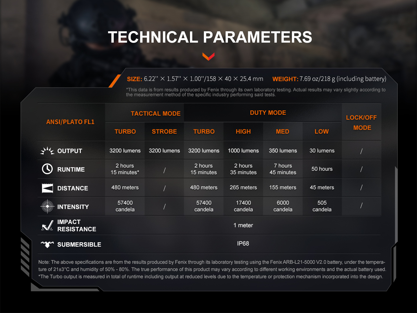Lighting Modes: Two operating modes: tactical Turbo and strobe, Duty mode with four brightness levels.