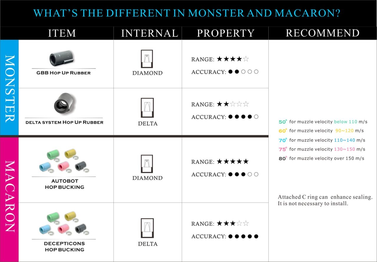 Hop-up bucking, along with a precision inner barrel, a chamber pressure system, and high-quality BBs, is one of the most crucial components affecting your weapon’s accuracy and range. If you want to shoot farther and more accurately, you don’t need to excessively increase muzzle velocity. It’s like adding gas to a car without a steering wheel. Finding the right setup is an art, and everyone has their own formula that works best for them.Hop-up buckings are available in various models, each designed for a specific type of inner barrel (AEG/HPA, GBB/VSR, Hybrid), muzzle velocity (shore hardness), outdoor temperature (classic and silicone buckings), and most importantly, their purpose (range or accuracy).The longer and wider the contact surface with the bucking, the greater the range you can achieve, though this might come at the expense of accuracy compared to using buckings with an arrow/diamond-shaped patch. These buckings offer better initial contact across the BB width, transitioning to an arrow point to guide the BB, improving accuracy and grouping. However, they might not impart as much spin for greater distances as wider patches.To help you choose, below is a breakdown of different bucking types, making your selection easier. Ultimately, finding the right one is a personal journey.