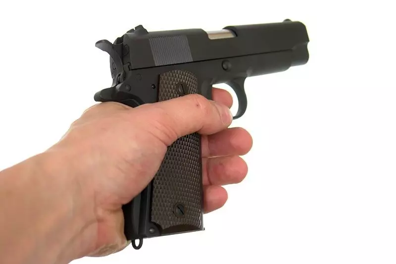 Replika pistoletu C1943, wywodzącego się z konstrukcji zaprojektowanej w 1900 roku przez Johna Browninga – a więc C1911A1 zmodyfikowanego podczas II Wojny Światowej na potrzeby amerykańskich oficerów i krajów korzystających z pomocy tzw. ustawy lend-lease. Zamek, rękojeść i części wewnętrzne wykonane są z szarawego metalu, doskonale imitującego kolor anodyzowanego oryginału, zaś okładziny rękojeści – z ABSu. Pistolet zasilany jest greengasem.