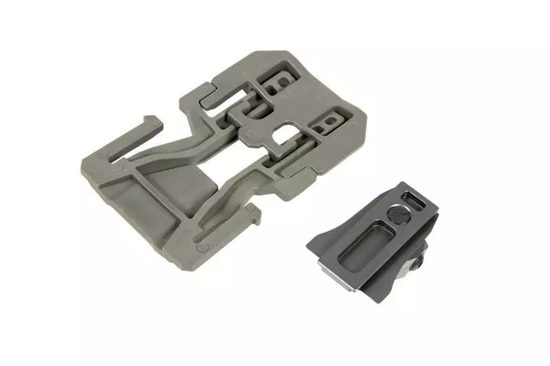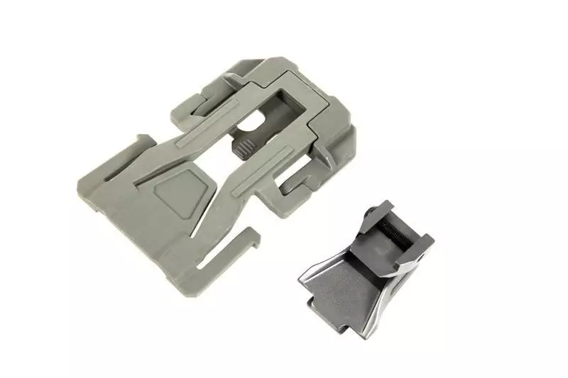 Montaż umożliwiający montaż repliki na oporządzeniu w standardzie MOLLE. Produkt został wykonany z aluminium i tworzywa sztucznego.
