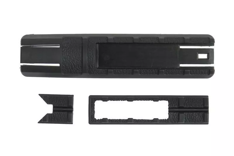 Wykonana z wytrzymałego i plastycznego tworzywa sztucznego, profilowana okładzina na szyny standardu R.I.S./R.A.S. w kolorze czarnym. Wyposażona w podłużną kieszonkę z przykryciem oraz kanał na kabel. Długość okładziny: 160 mm.