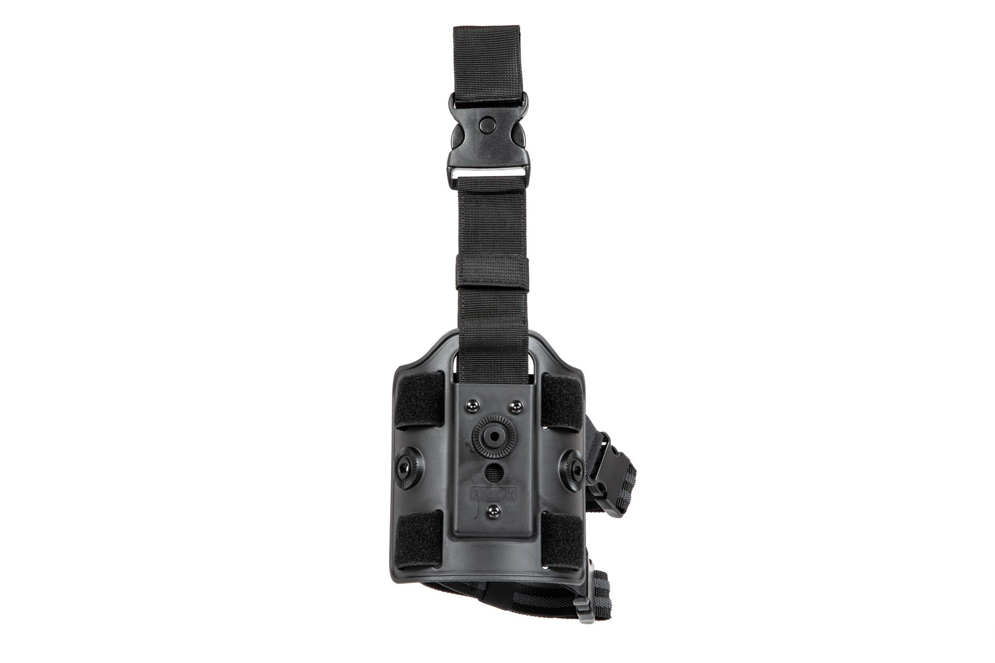 Wykonany z tworzywa przez firmę Amomax panel udowy przeznaczony do montażu kabur oraz akcesoriów wyposażonych w system rotacyjny. Pasy utrzymujące panel przy udzie zostały powleczone tworzywem gumowym, dzięki któremu panel pozostaje na miejscu nawet przy wzmożonym ruchu.