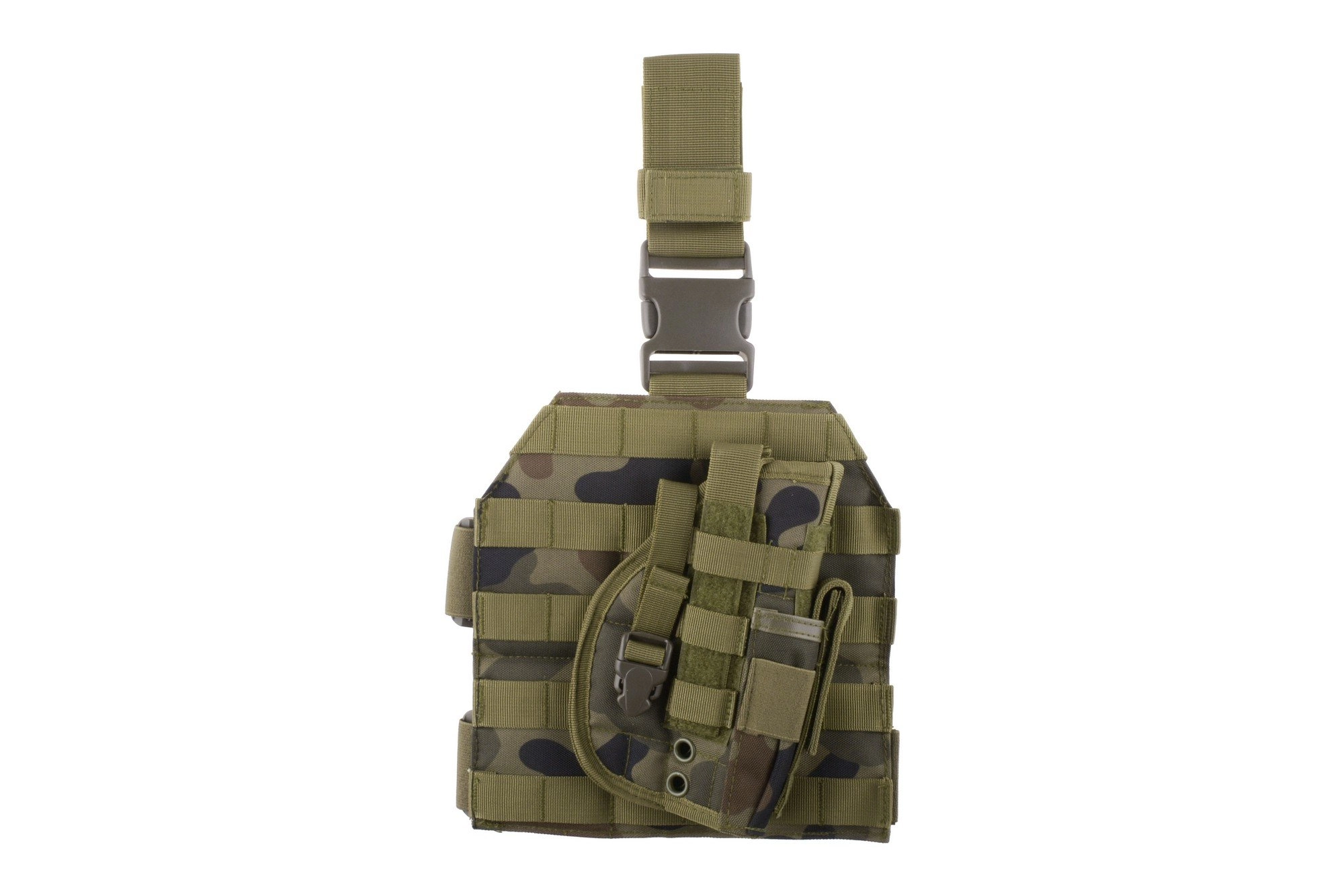 Panel udowy wykonany jest z nylonu. Montuje się go na pas biodrowy oraz dwoma regulowanymi pasami na udo. Pasy na udo wykonane są z elastycznego materiału, dodatkowo posiadają regulację umożliwiającą dostosowanie ich do obwodu uda użytkownika. Panel pokryty jest palsami zgodnymi z systemem Molle. Kabura uniwersalna montowana na Molle posiada dodatkowo ładownicę na zapasowy magazynek.