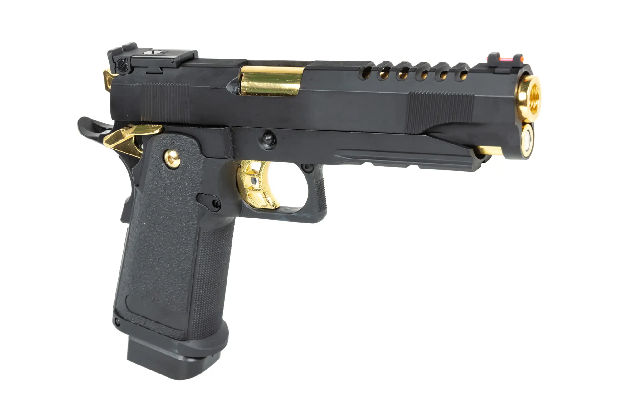 Chwyt pistoletowy (z tworzywa) posiada ergonomiczną, chropowatą fakturę, która ułatwi kontrolę nad pistoletem. Na dodatkową uwagę zasługuje ciekawie wyglądający, szkieletowy język spustowy oraz front kabłąku, który również posiada chropowatą powierzchnie. Będzie można na nim wygodnie oprzeć niedominującą rękę podczas strzelania. Pod lufą znajdziemy szynę, która pozwoli zamontować dodatkowe akcesoria takie jak latarka czy laser.