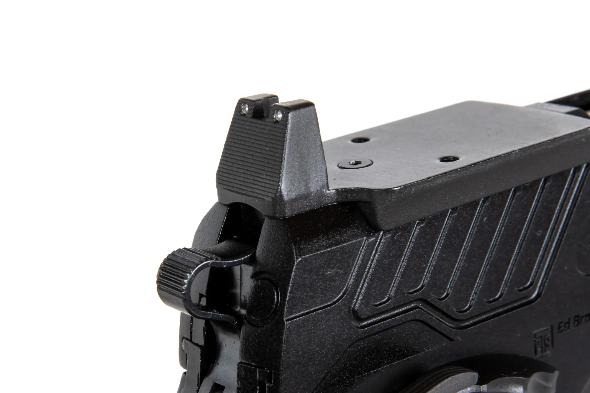PTS ZEV ED-Brown 1911 został wyposażony w bezpiecznik w chwycie pistoletowym oraz dwustronny skrzydełkowy bezpiecznik, który uniemożliwi oddanie strzału po przeładowaniu.