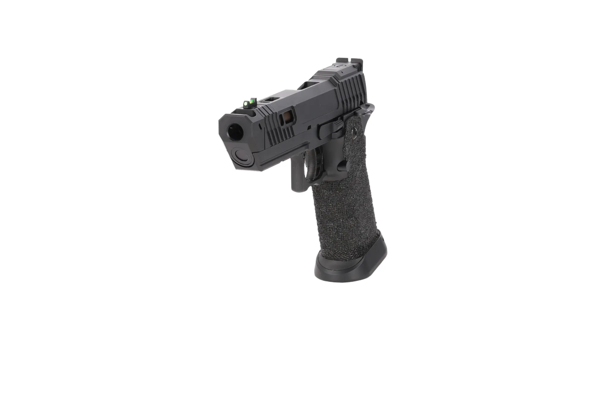 Chropowata rękojeść (ręcznie robiony stippling) wykonana z tworzywa zapewnia pewny, antypoślizgowy chwyt podczas dynamicznych manewrów a powiększony lejek ułatwi przeładowanie.
