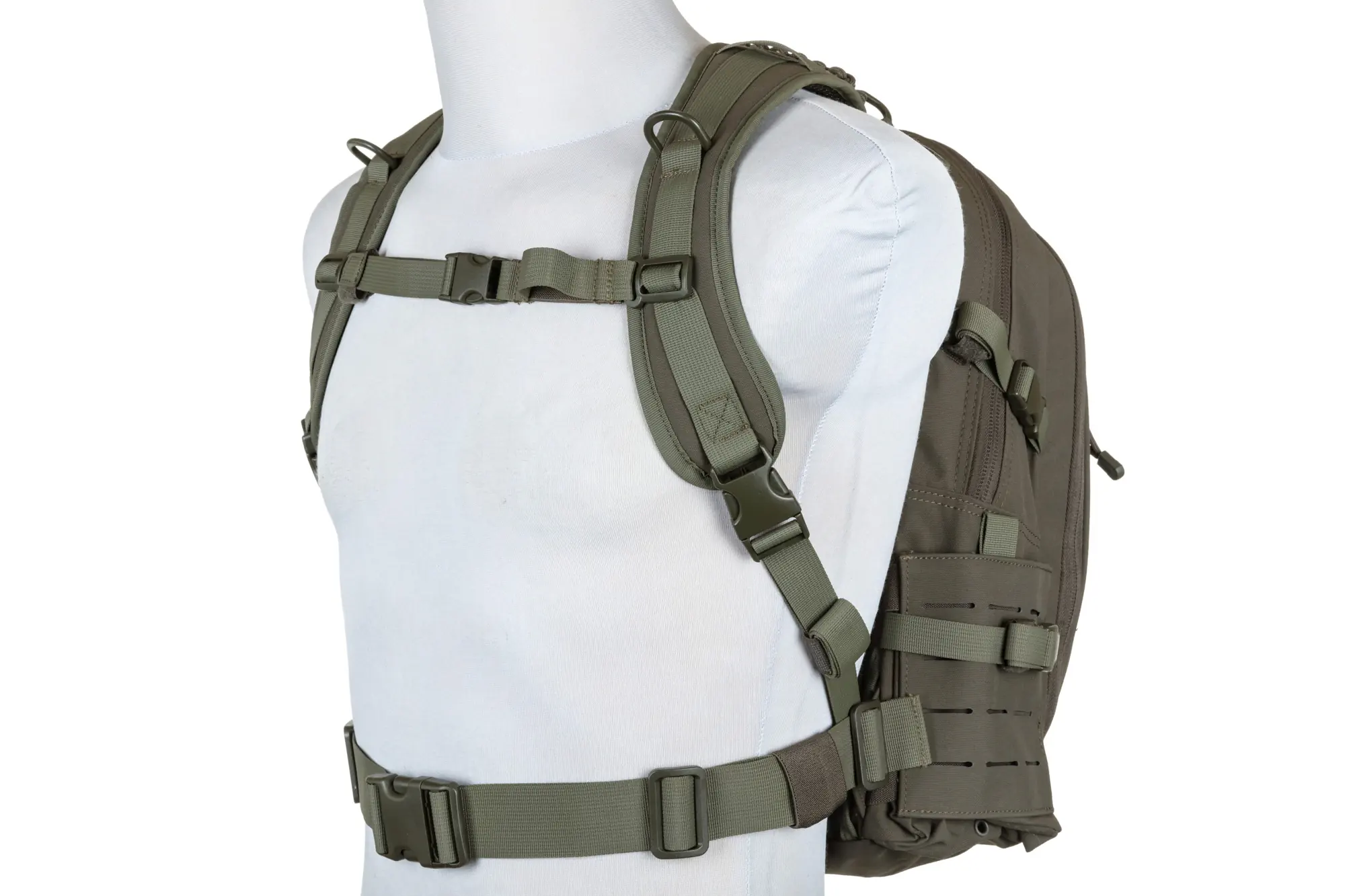 Niezawodnymi zamkami błyskawicznymi, frontowym panelem Molle Laser-Cut, panelem-rzep na naszywki lub identyfikator, bocznymi kieszeniami, które na froncie posiadają panele Molle Laser-Cut, regulowanym pasem biodrowym, regulowaną taśmą piersiową, dodatkową przegrodą “na plecach” na np. wkład hydracyjny, miękkimi comfort-padami dla zwiększenia wygody pleców użytkownika. Wewnętrzna strona plecaka jest częściowo pokryta tkaniną typu Mesh.