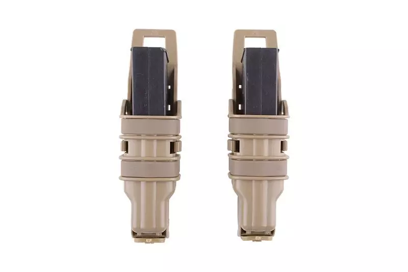 Wykonany z wytrzymałego tworzywa polimerowego przez Primal Gear zestaw 2 szybkich ładownic do magazynków pistoletowych. Nie posiadają klap, co umożliwia błyskawiczne dobycie magazynka, a jednocześnie trzymają go pewnie i nie pozwalają na przypadkowe wypadnięcie, nawet po montażu “do góry nogami”. Zapewnia to konstrukcja ładownicy – składa się ona z dwóch połówek, mocno ściśniętych silikonowymi gumami.