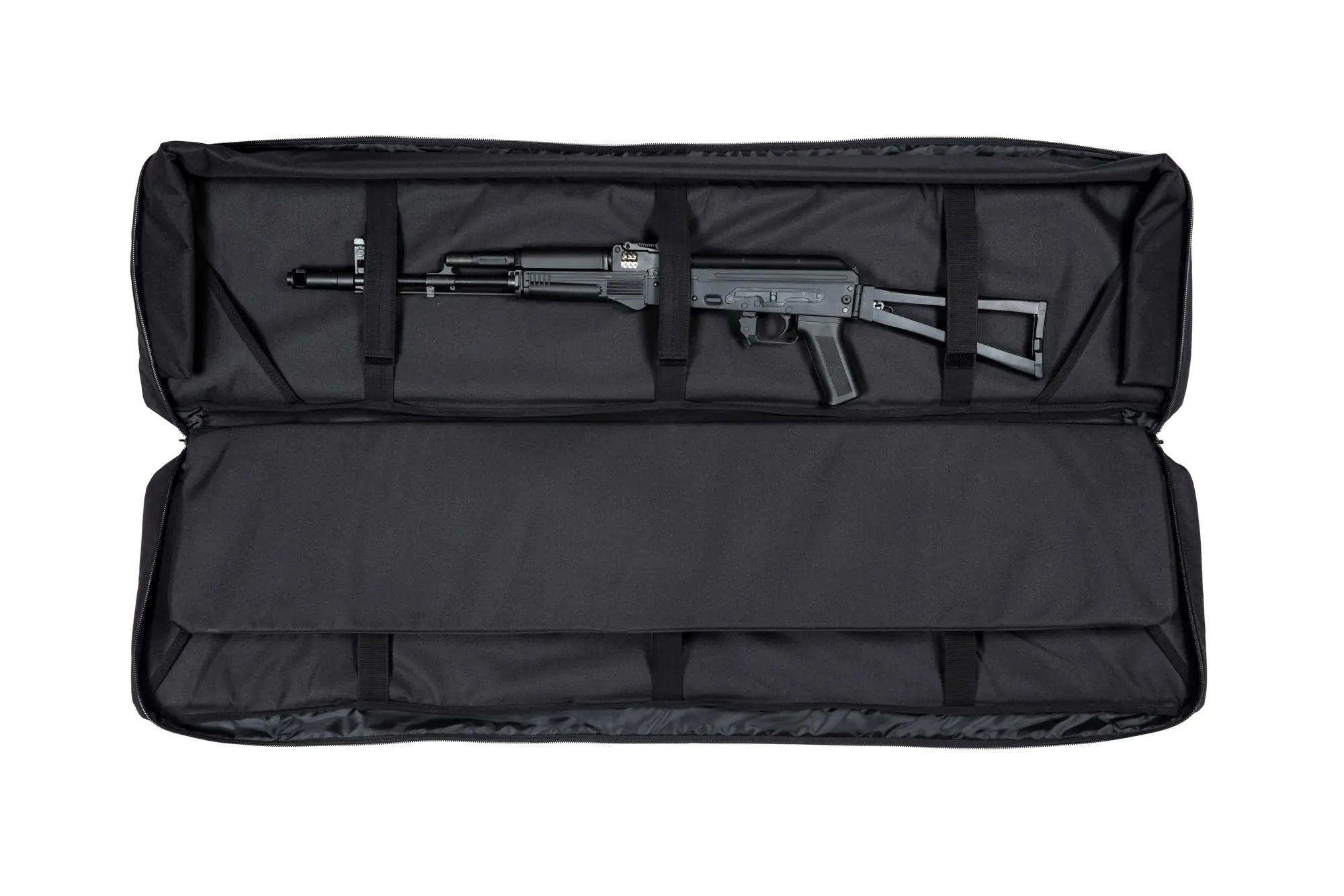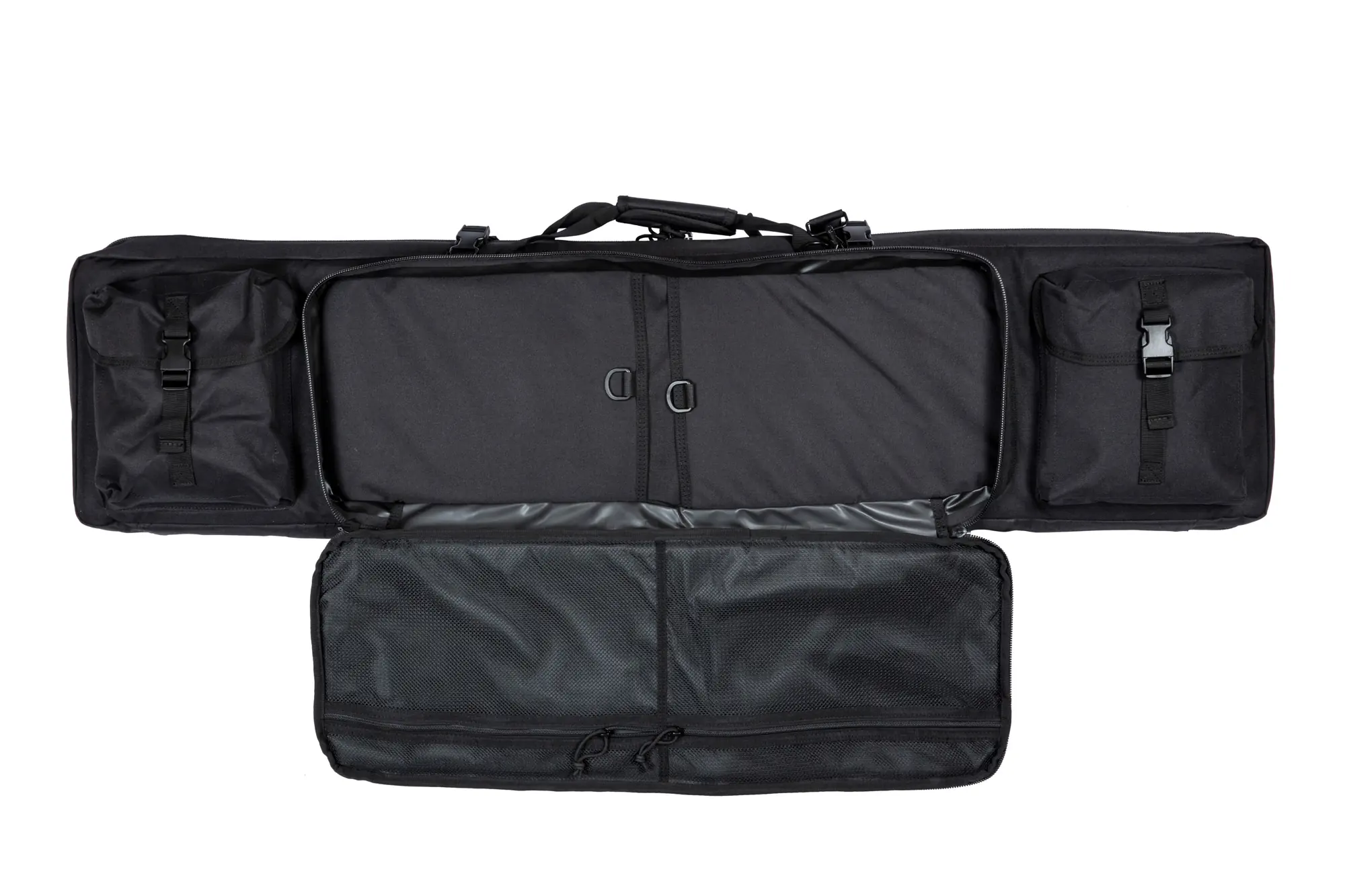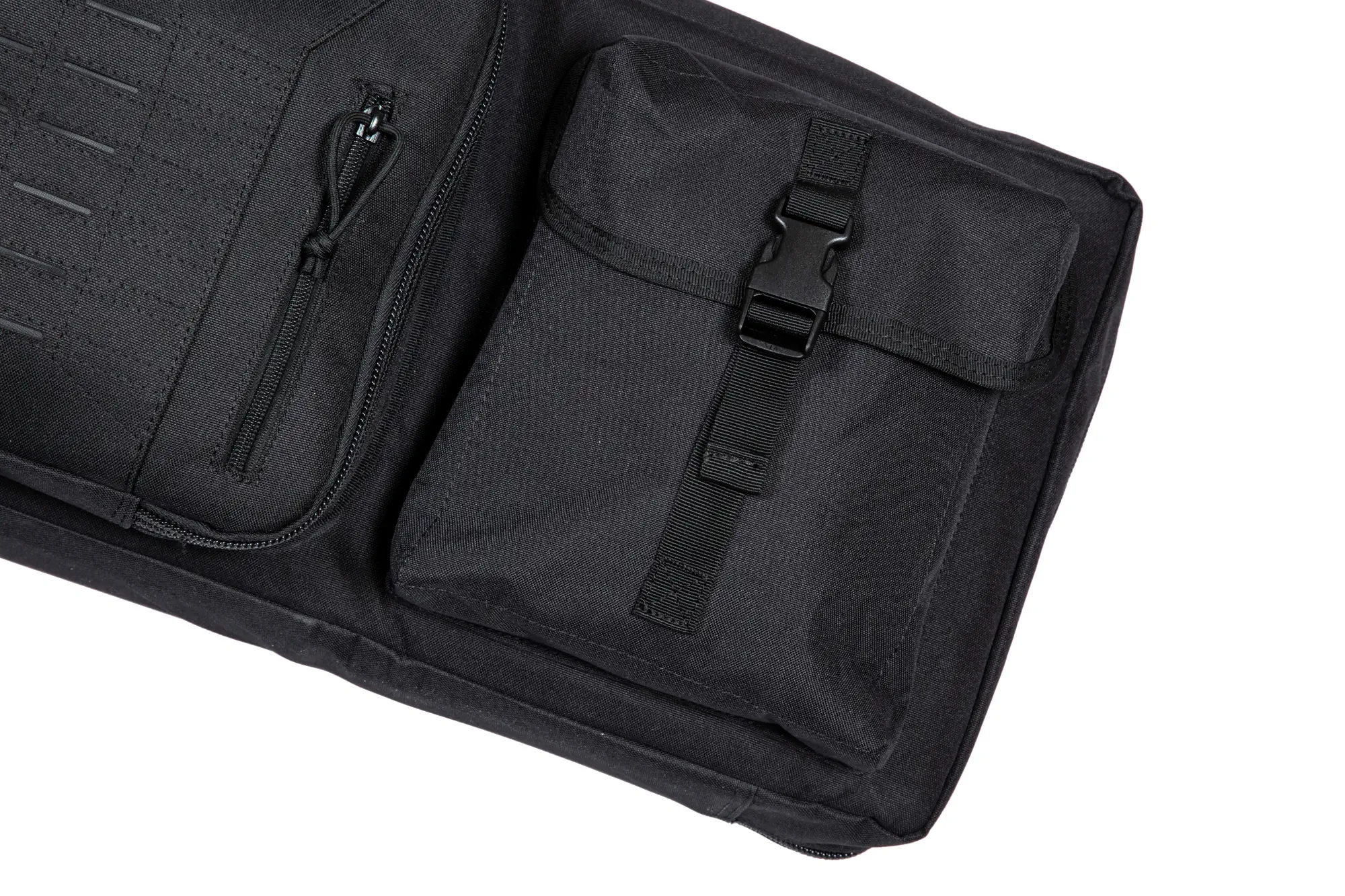 Na przedniej ściance pokrowca znajduje się druga, mniejsza komora o wymiarach 750x300mm z wewnętrznymi przegrodami z siatki (idealnie mieści np. broń krótką, a nawet pistolet maszynowy) a także dwie pojemne kieszenie na dodatkowe akcesoria, magazynki etc. Kieszeniezamykane są przy pomocy fastexów oraz rzepów.