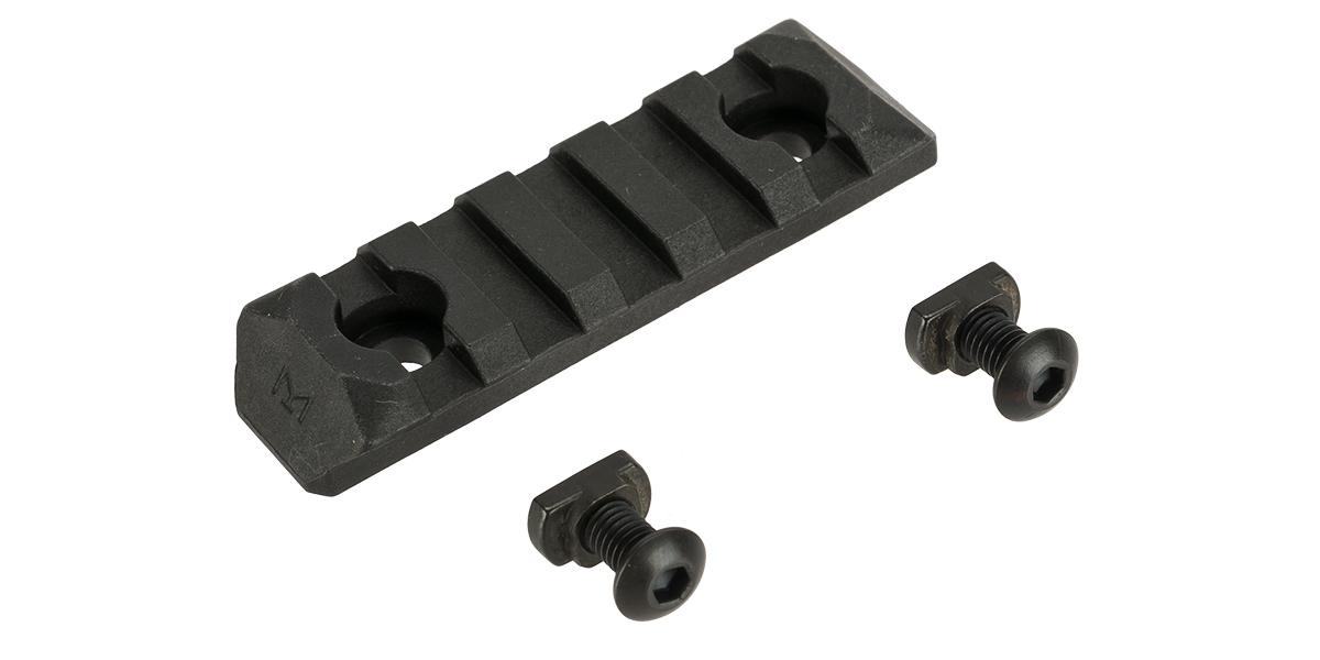 <p>The rail is made from durable <strong>polymer</strong>, combining low weight with sufficient strength for common accessories. It is a <strong>high-strength reinforced polymer</strong> resistant to recoil stress. The <strong>low-profile design</strong> reduces bulk on the handguard and the <strong>double-chamfered edges</strong> minimize the risk of snagging on gear or obstacles. With a length of <strong>60 mm</strong> and a total of <strong>5 slots</strong>, it provides enough space for various RIS mounts. Installation is done using the included screws and M-LOK nuts.</p>