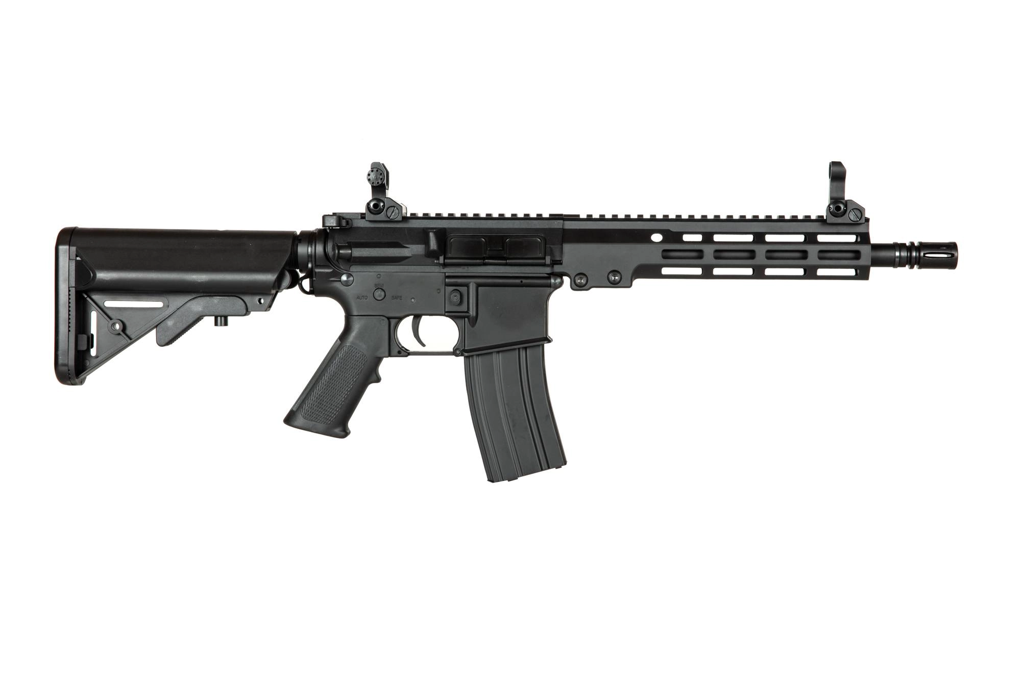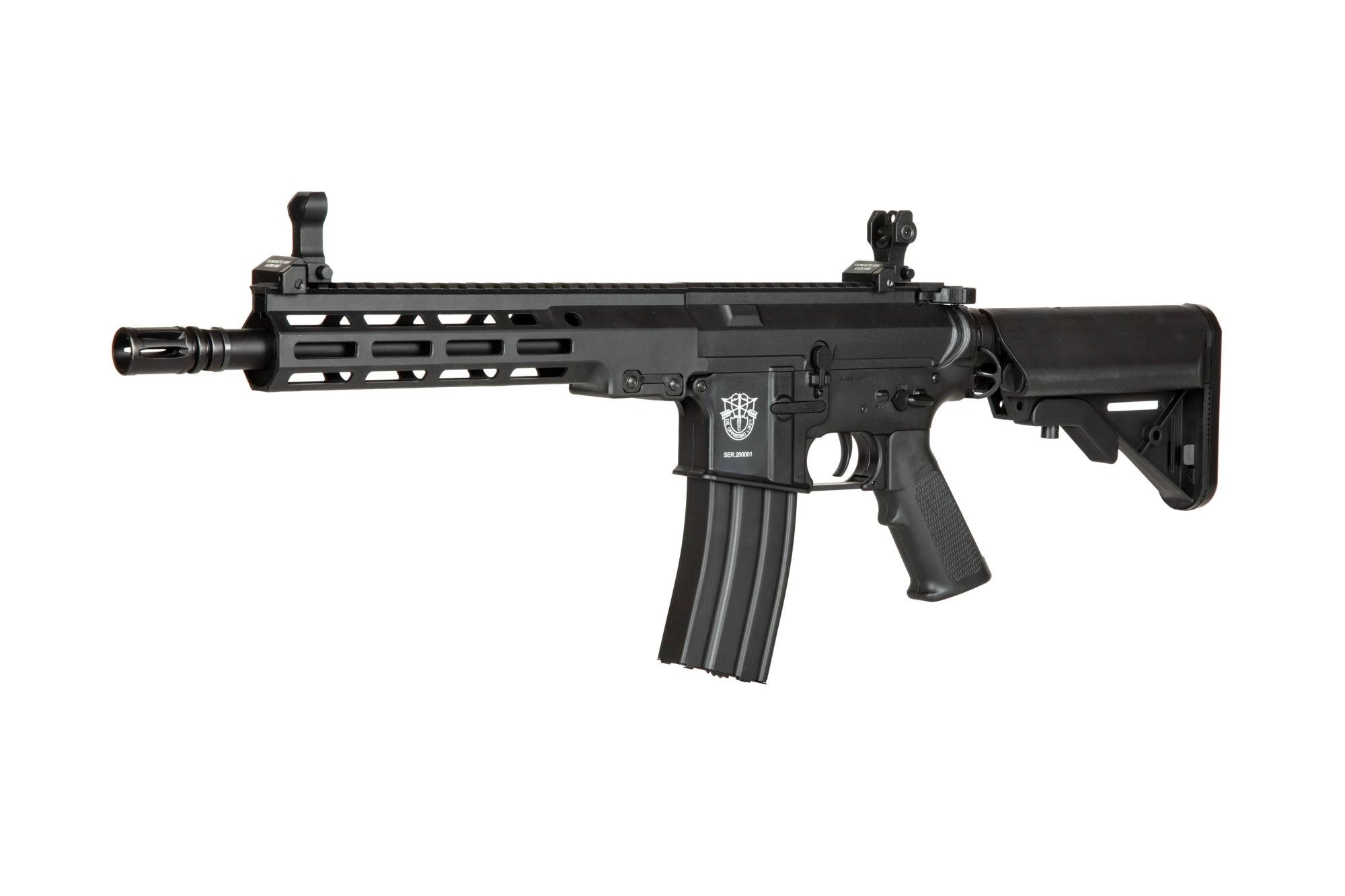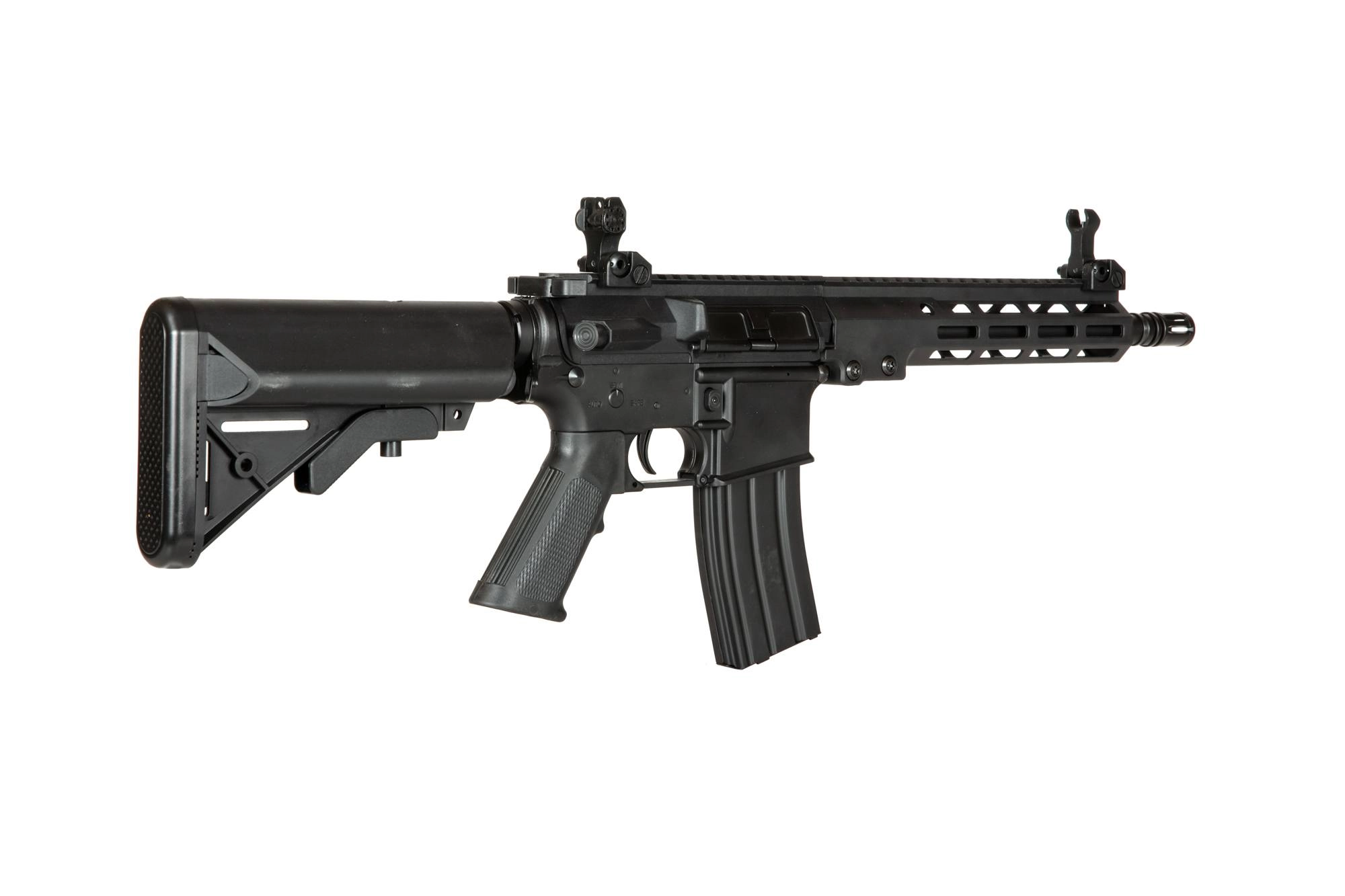 Serię replik polimerowych od Classic Army charakteryzuje wykonanie z wytrzymałego tworzywa sztucznego co pozwoli na znaczne obniżenie wagi repliki. Regulowana kolba typu SF pozwala zaś na dopasowanie długości repliki do użytkownika i czyni z niej kompaktowa konstrukcję, idealną do rozgrywek CQB i pomieszczenie akumulatora. Na grzbietowej szynie RIS umieszczono składane przyrządy celownicze.