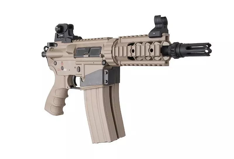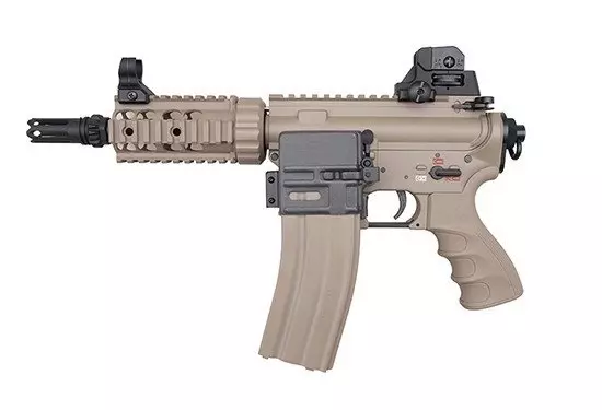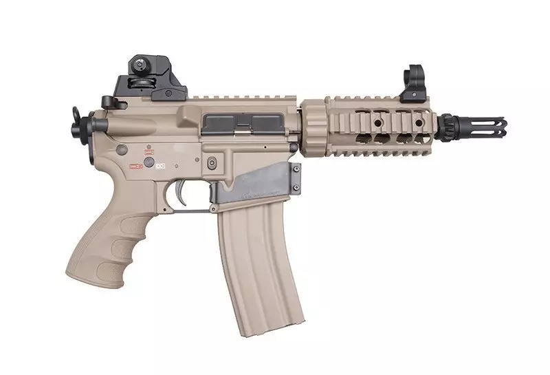 Replika wykonana jest z elementów metalowych oraz tworzywa. Z tworzywa sztucznego wykonano chwyt pistoletowy. Język spustowy, magazynki, łącznik magazynków, uchwyt zawieszenia taktycznego, tłumik płomienia oraz drobne elementy montażowe wykonane zostały ze sta.i. Pozostałe elementy wykonano ze stopu cynku i aluminium. Replika posiada profilowany chwyt pistoletowy, który wygodnie leży w dłoni. Ciekawym rozwiązaniem jest umieszczenie akumulatora.