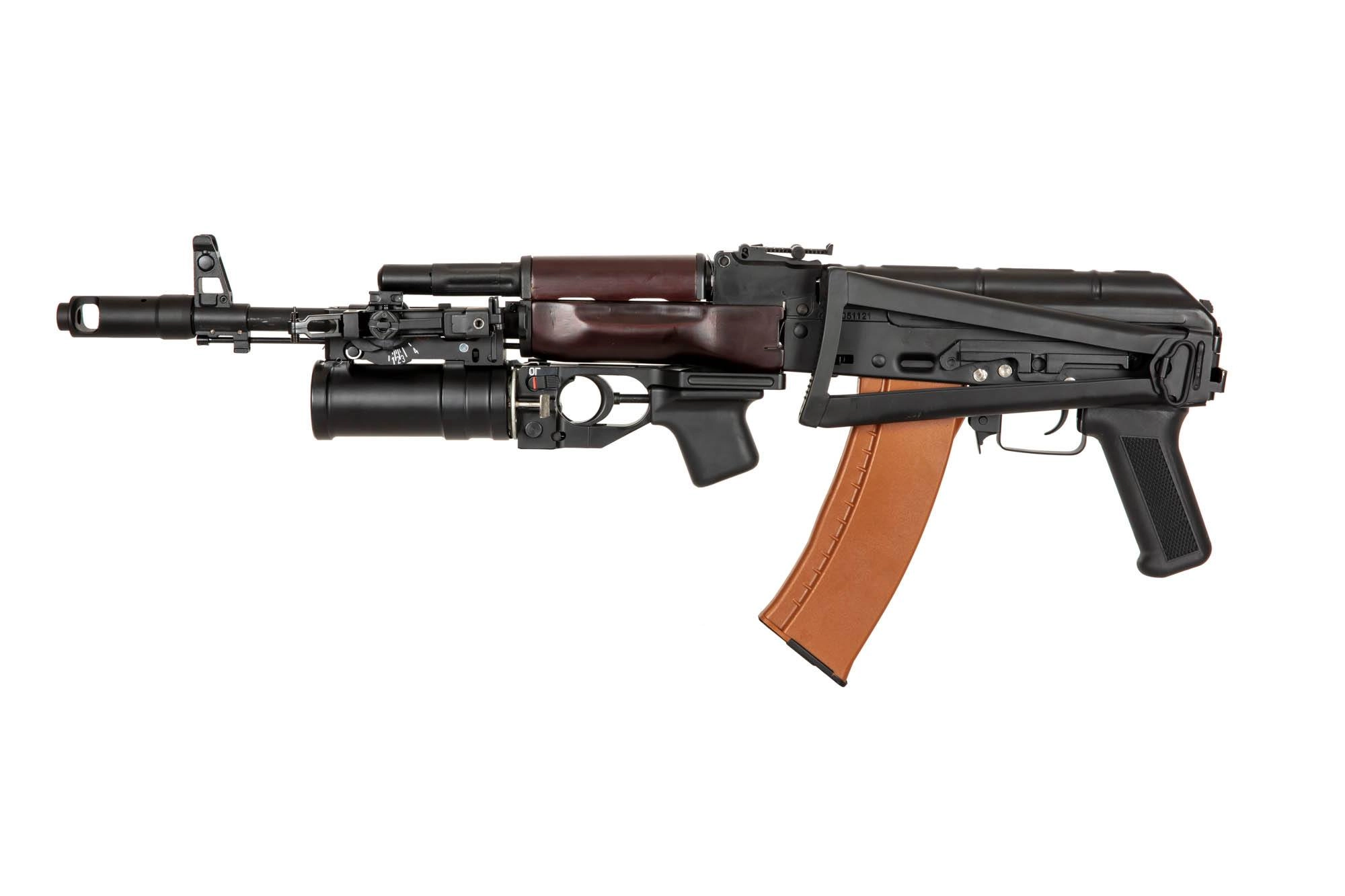 Co ciekawe replika została wyposażona w replikę rosyjskiego granatnika w zestawie z granatem gazowym typu VOG na 32 kulki.