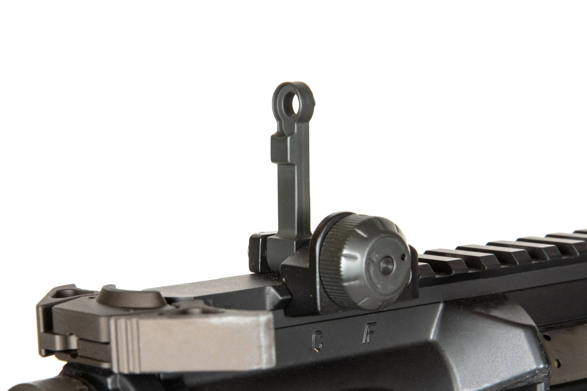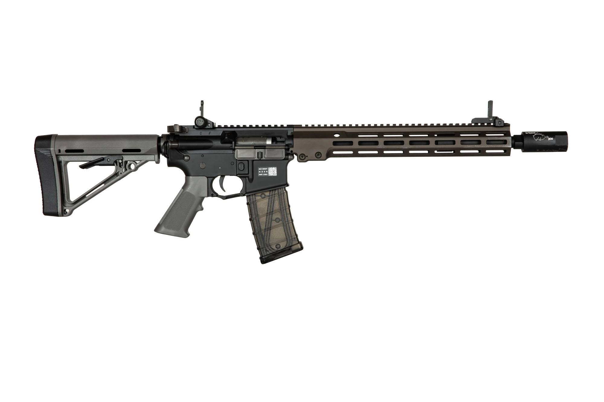 Replika zaopatrzona jest w wielopozycyjną, teleskopową kolbę BOM Stock – z grubą stopką z tworzywa oraz otworami do mocowania zawieszenia taktycznego QD. Na grzbiecie korpusu znajduje się szyna RIS 22mm z zamontowanymi metalowymi celowniczymi przyrządami mechanicznymi. W chwycie przednim repliki zastosowano system montażu typu M-lok pozwalający na spersonalizowanie repliki pod własne wymagania i montaż dodatkowych akcesoriów jak chwyty czy latarki taktyczne. Całość repliki wieńczy w tłumik płomieni typu Firehog. W skład zestawu wchodzi także polimerowy magazynek typu mid-cap mieszczący ok. 140 kulek.