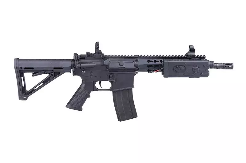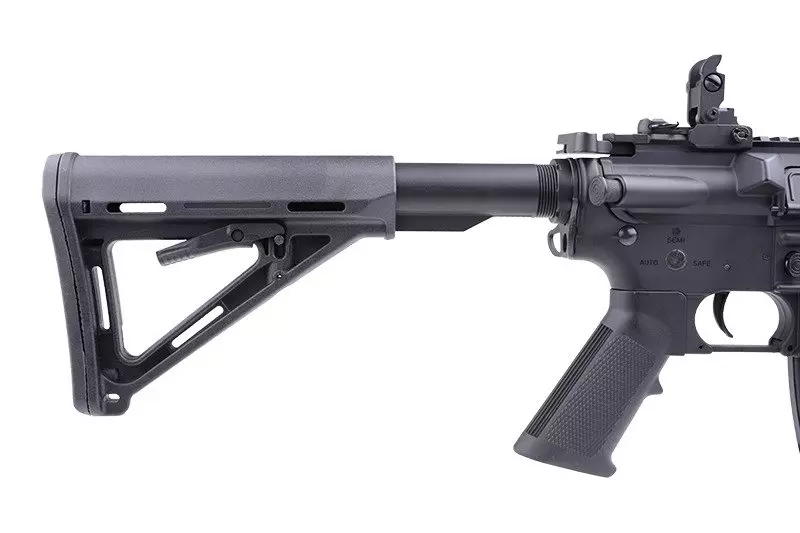 Akumulator repliki mieści się wewnątrz dołączonej do zestawu atrapy puszki AN/PEQ, którą montujemy na chwycie przednim. Karabinek posiada teleskopową kolbę typu CTR o regulowanej długości, zakończoną wygodną stopką z twardej gumy. Na grzbietowej szynie RIS zamontowano komplet mechanicznych przyrządów celowniczych – stałą muszkę oraz składany przeziernik typu flip-upLufa zewnętrzna została zakończona standardowym, 14mm gwintem lewoskrętnym, na którym osadzono tłumik płomienia.