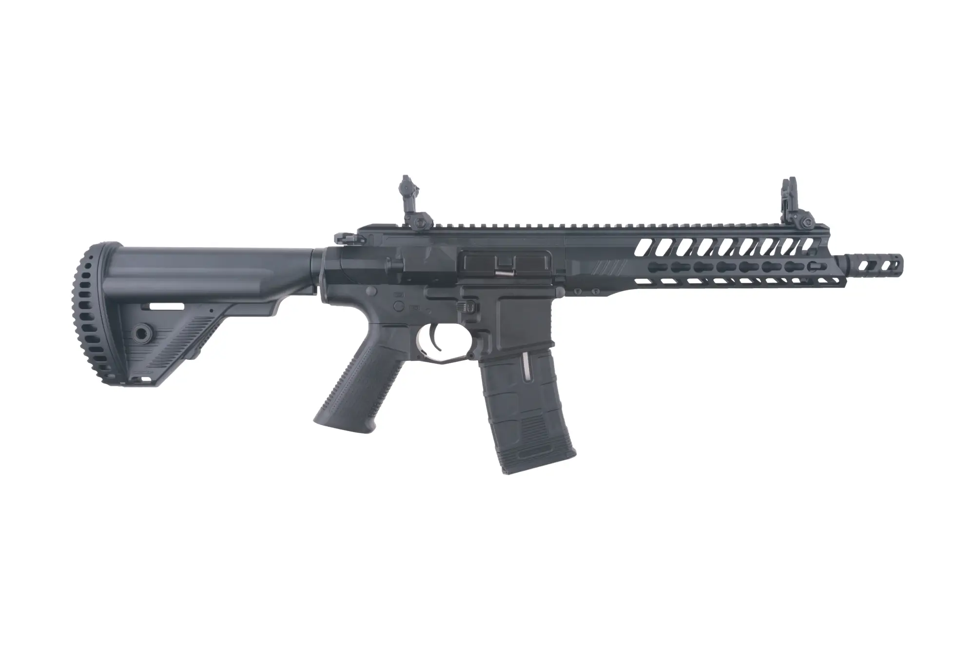 Wykonana z najwyższej jakości materiałów replika karabinka CXP-YAK w wersji SBR S1. Replikę wykonano prawie w całości z metalu w technologii CNC – ciekawie wyglądający korpus repliki oraz front z systemem Keymod wykonano właśnie z metalu. Z wytrzymałego tworzywa sztucznego wykonano kolbę z regulowaną pozycją, ergonomiczny chwyt pistoletowy, mieszczący 300 kulek magazynek typu hi-cap oraz składane przyrządy celownicze.